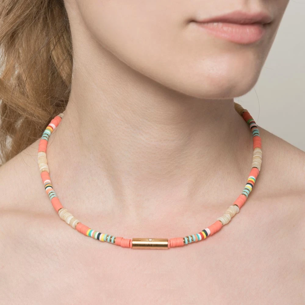 Il est composé de perles Heishi, de perles coquillages, de disques vinyl et dorées et d’un tube talisman.