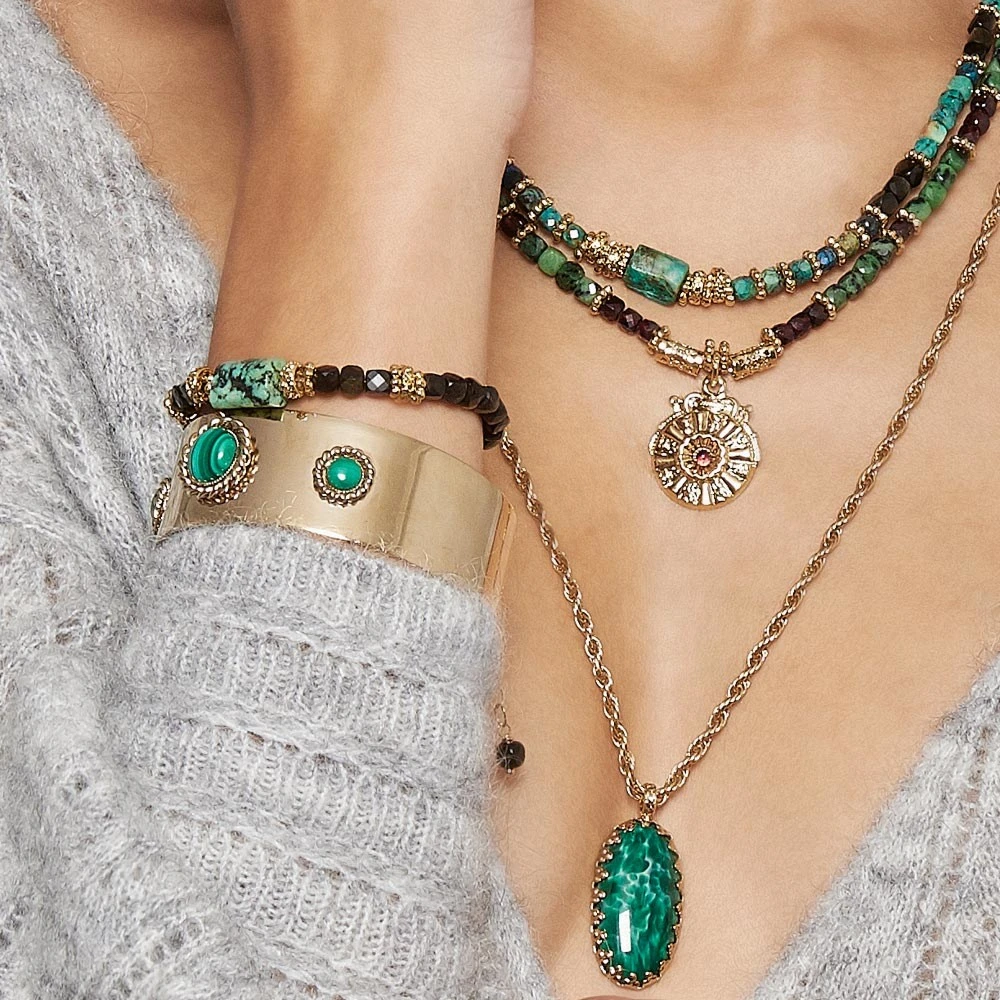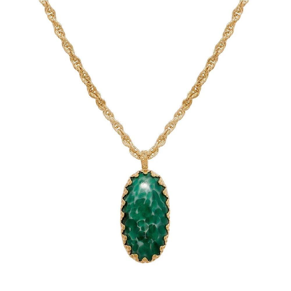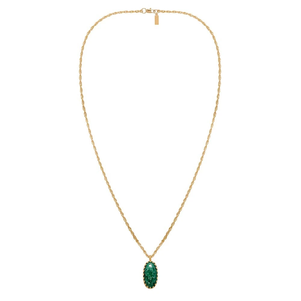 Ce long collier est en plaqué or et est signé Agnès Paris. Il et se compose d’une chaine torsadée et d’un médaillon cabochon en jade vert.