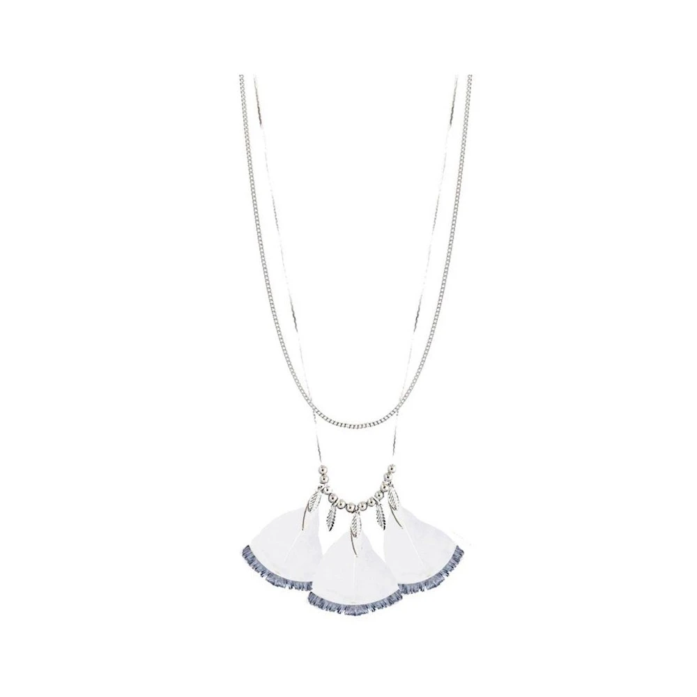 Ce Collier long double chaine, en laiton (garanti sans nickel), signé comptoir des muses, est orné de trois plumes véritables blanches trempées dans la peinture argentée, de trois navettes, cinq feuilles et douze perles argentées pour une belle finition ! Original et raffiné, sans aucun doute, ce bijou de créateur est fait pour vous.