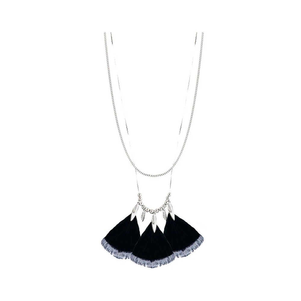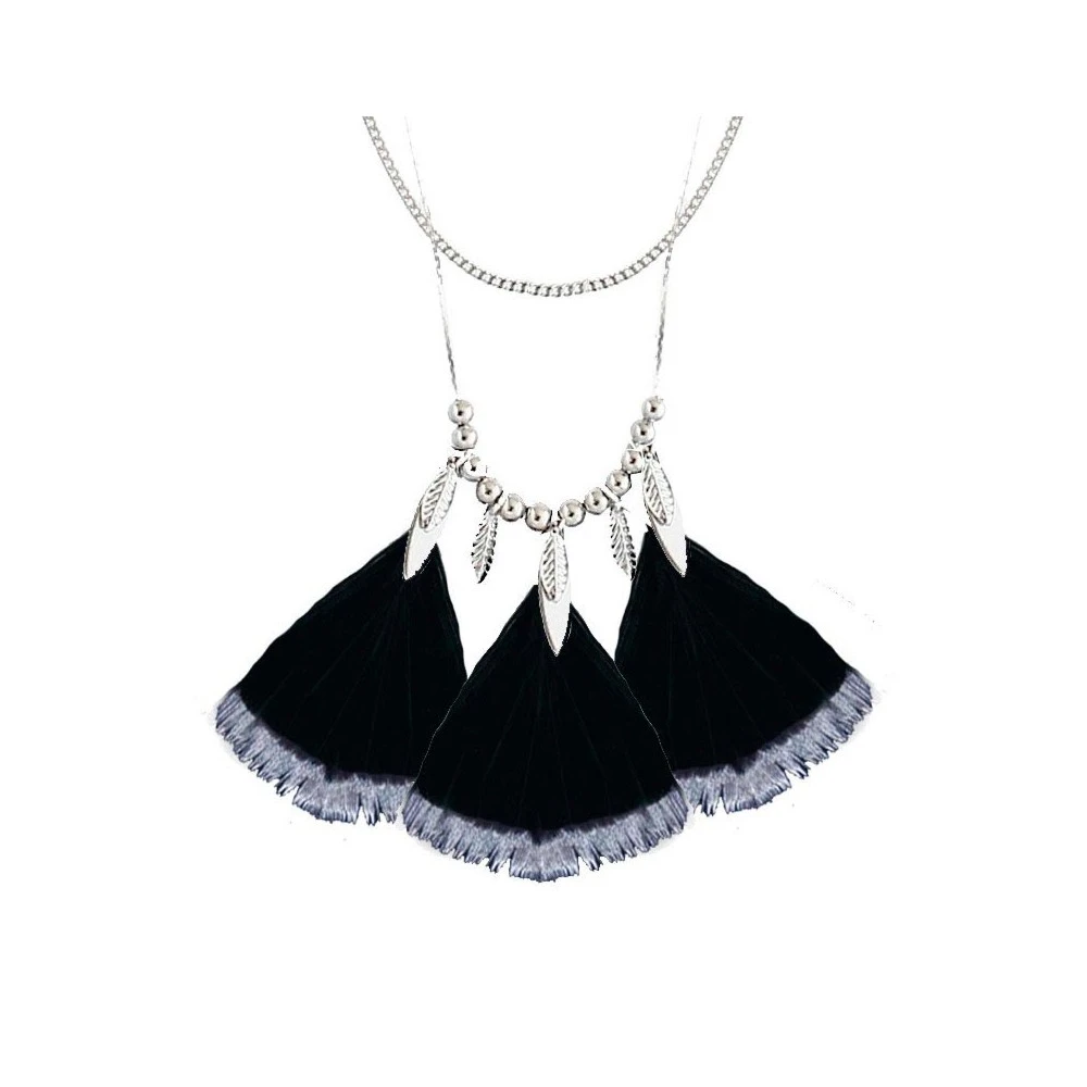 Ce Collier long double chaine, en laiton (garanti sans nickel), signé comptoir des muses, est orné de trois plumes véritables noires trempées dans la peinture argentée, de trois navettes, cinq feuilles et douze perles argentées pour une belle finition ! Original et raffiné, sans aucun doute, ce bijou de créateur est fait pour vous.