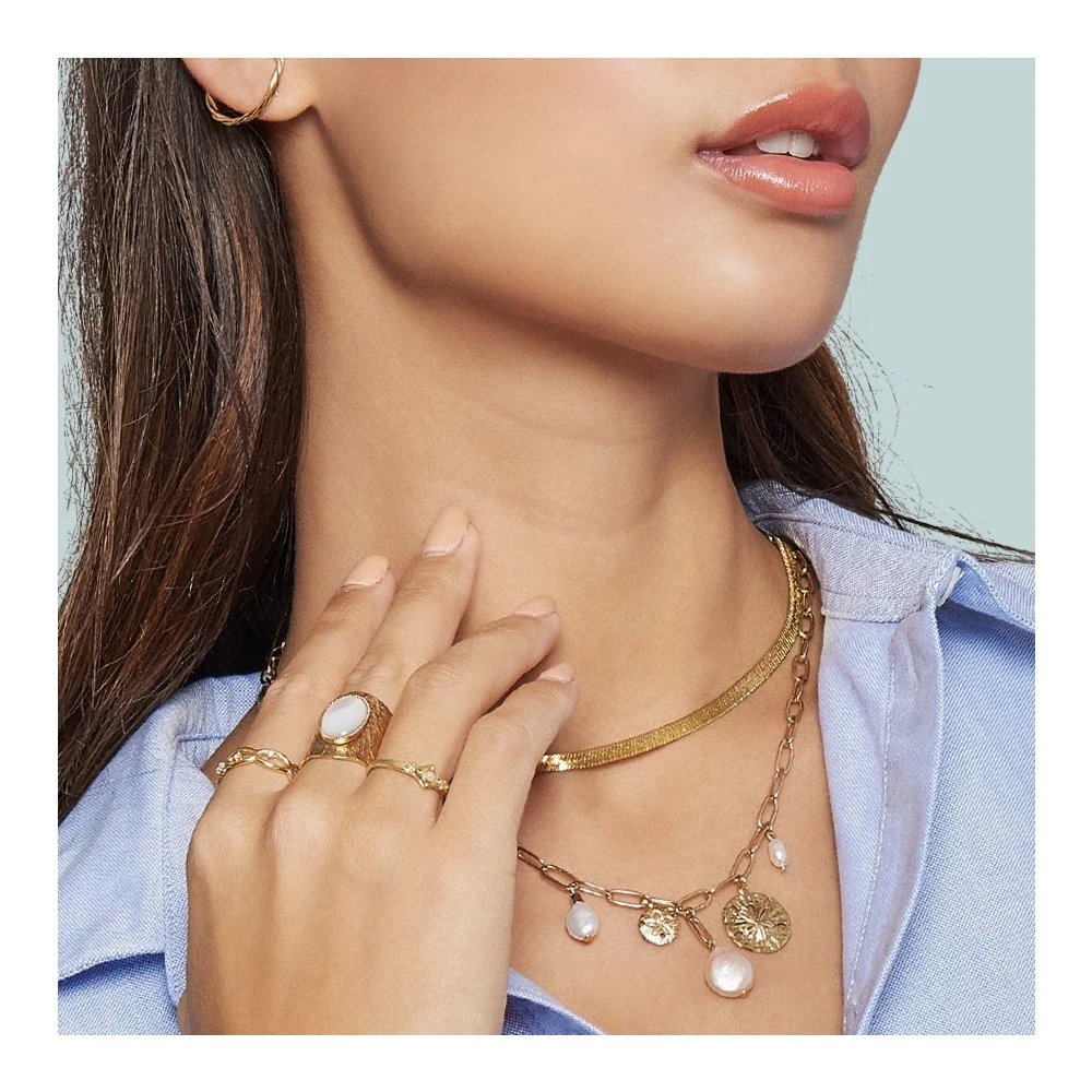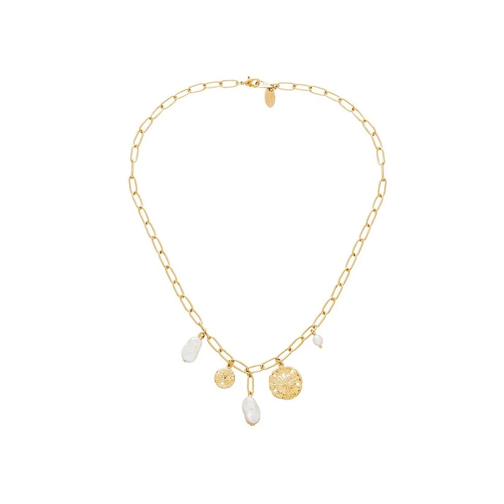Ce collier maillons Viadoli de la collection Oursin est en laiton doré à l’or fin 24 carats sans nickel. Il se compose de breloques médailles et perles de culture.