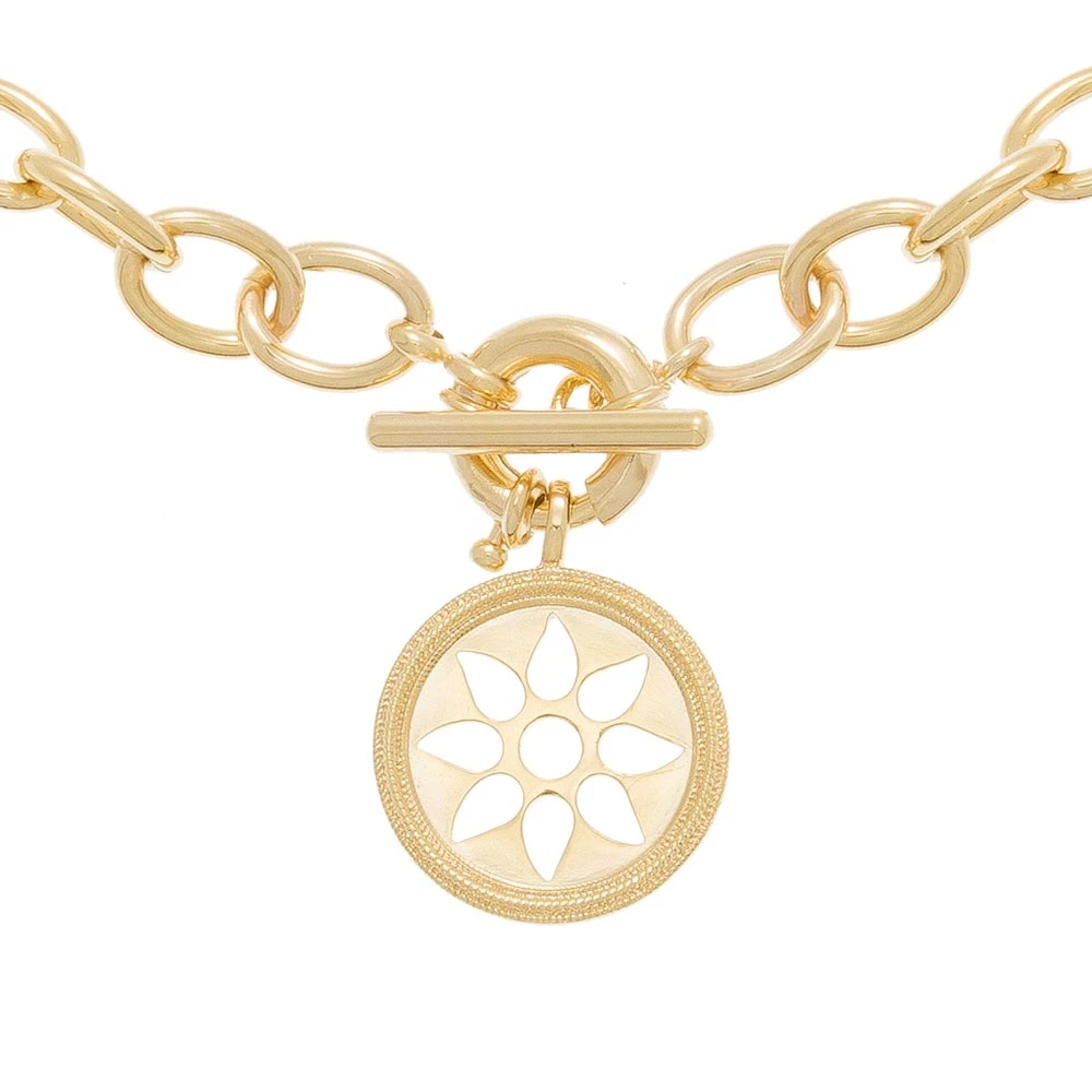 Ce collier est signé Collection Constance, en plaqué or. Il est orné de maillons larges ainsi que d’une médaille ronde avec une fleur ajourée.