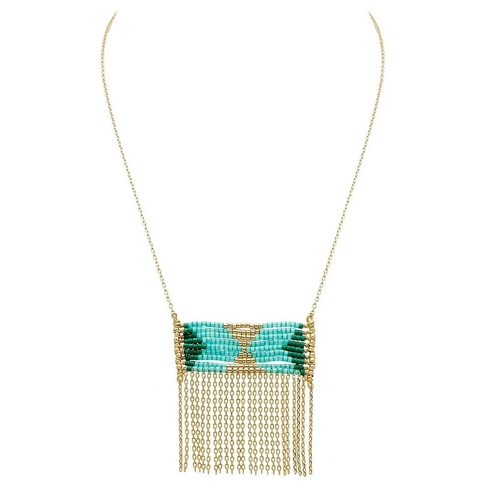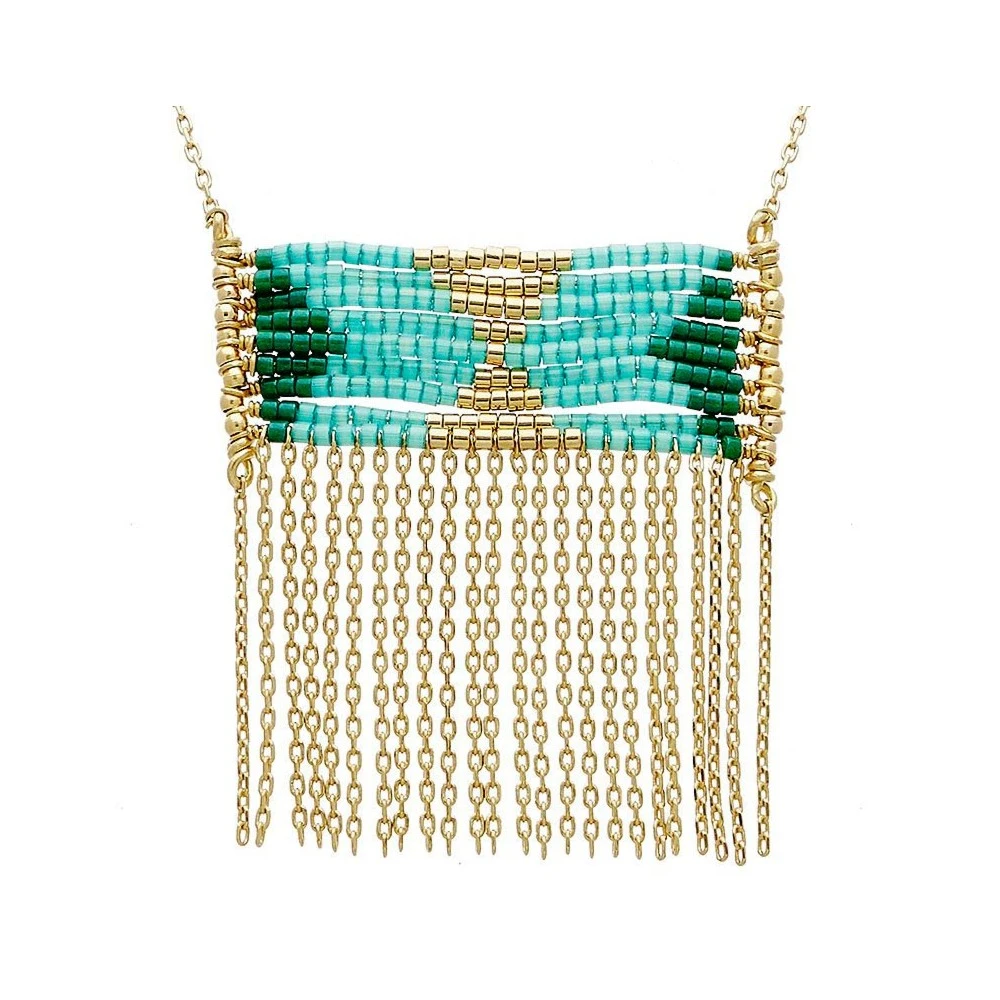Ce collier signé Caroline Najman, est composé d’une chaine plaqué or soutenant un rang de chaines orné de perles japonaises Miyuki couleur vert sapin et vert irisé. Adoptez un look ethnique et chic féminin à souhait!