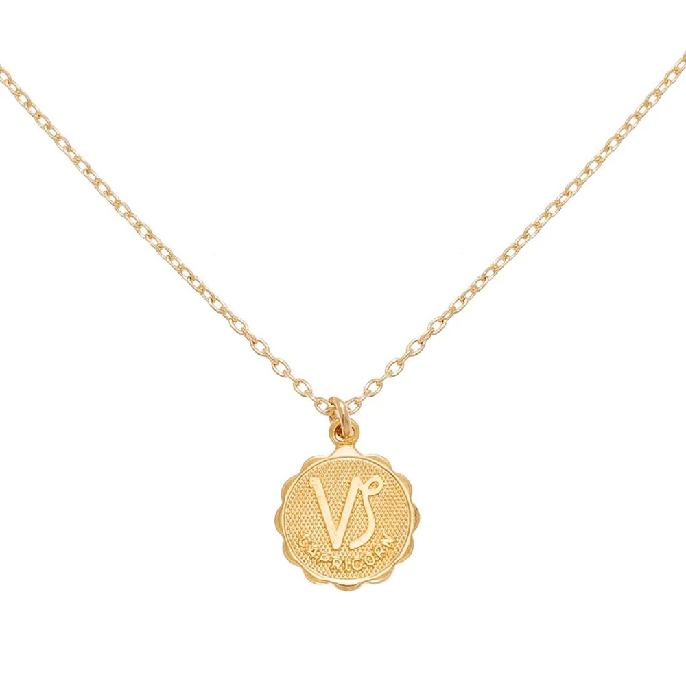 Collier fin signé Nilaï Paris, orné d’une médaille astrologique Capricorne aux contours irréguliers. Le collier est doré à l’or fin 24k.