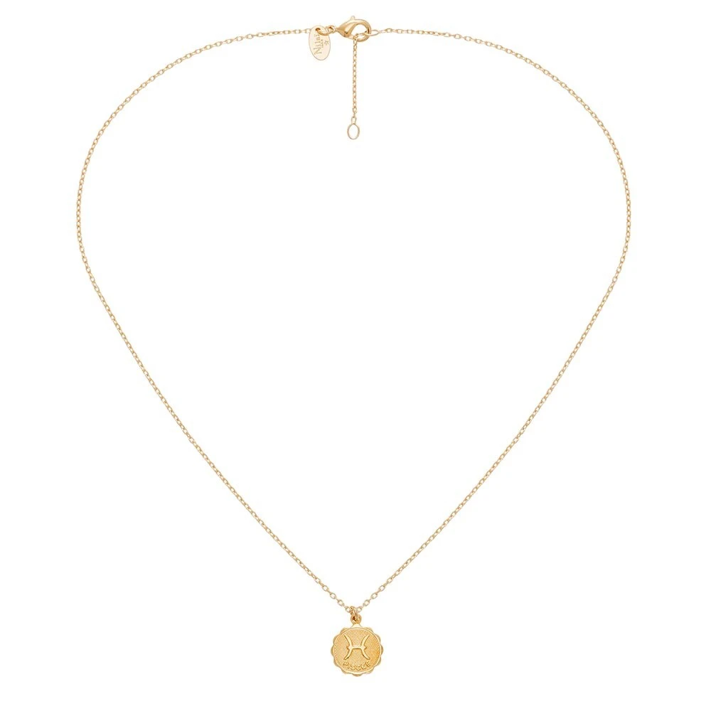 Collier fin signé Nilaï Paris, orné d’une médaille astrologique Poisson aux contours irréguliers. Le collier est doré à l’or fin 24k.