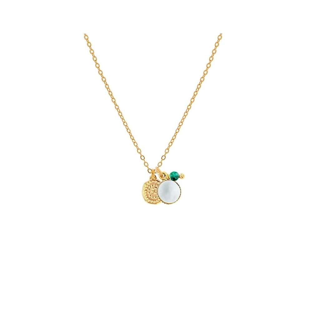 Ce collier médaille, signé Laëti Trëma, doré à l’or fin, est composé de breloques en pierres nacre et jaspe.
