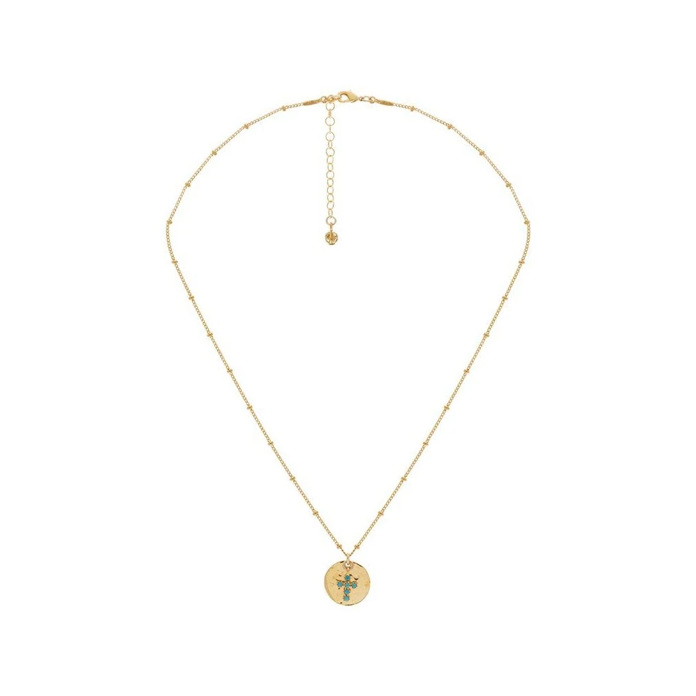 Collier de la créatrice By Garance, composé d’une fine chaîne dorée ornée de petites billes et d’un pendentif médaille martelée décorée d’une croix certie de pierres turquoises.