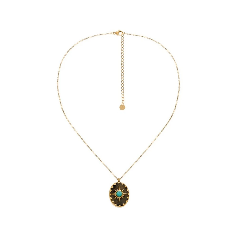 Collier médaille soleil en acier chirurgical trempé dans un bain doré, composé d’une pierre semi-précieuse en turquoise et signé Siloé Paris. La chaîne de ce collier est torsadée.