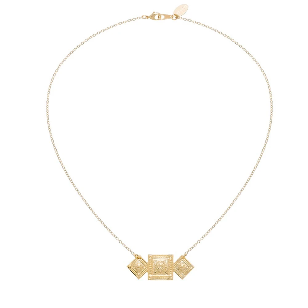 Le collier est orné de trois médailles carrées aux motifs ethniques.