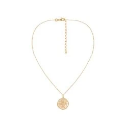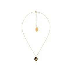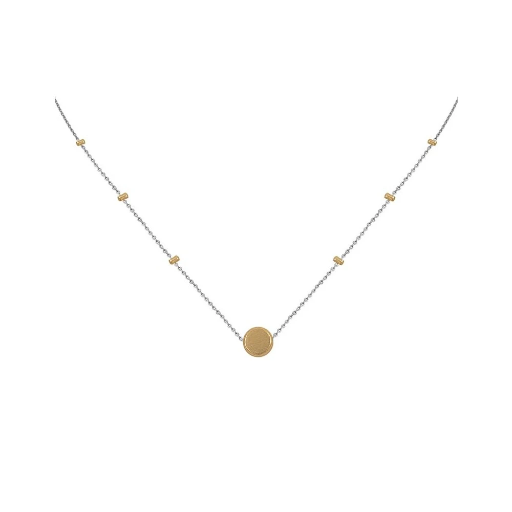 Collier signé Caroline Najman, de la collection Raw. Il est doré à l’or fin 24 carats, composé d’un pendentif rond doré, ainsi que d’une chaîne argentée agrémentée de petits détails dorés.
