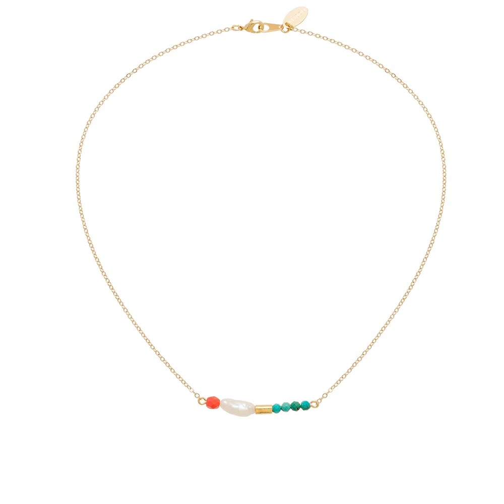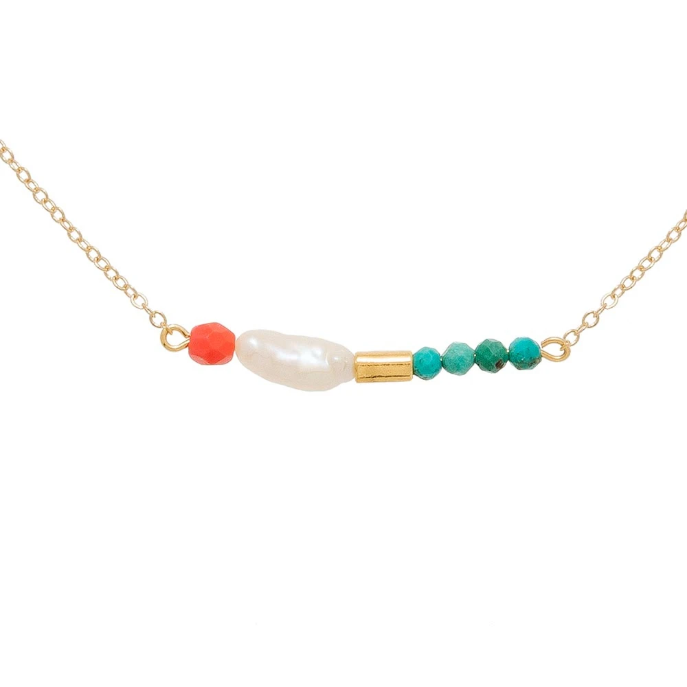 Le collier est orné d’une perle de culture, d’une perle corail, d’une perle dorée et de quatre perles amazonite.