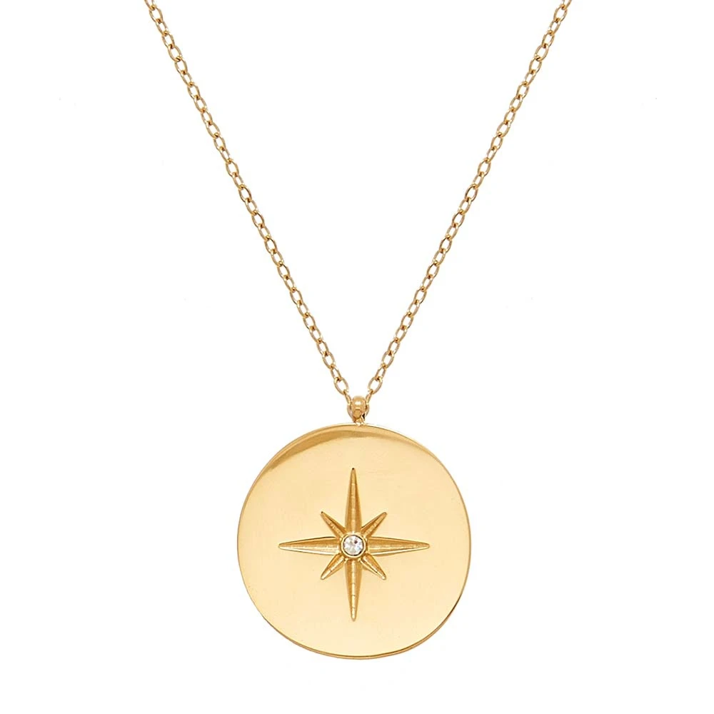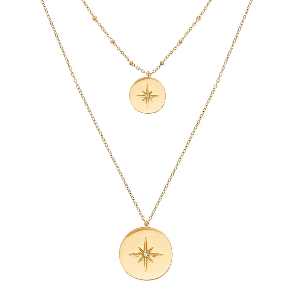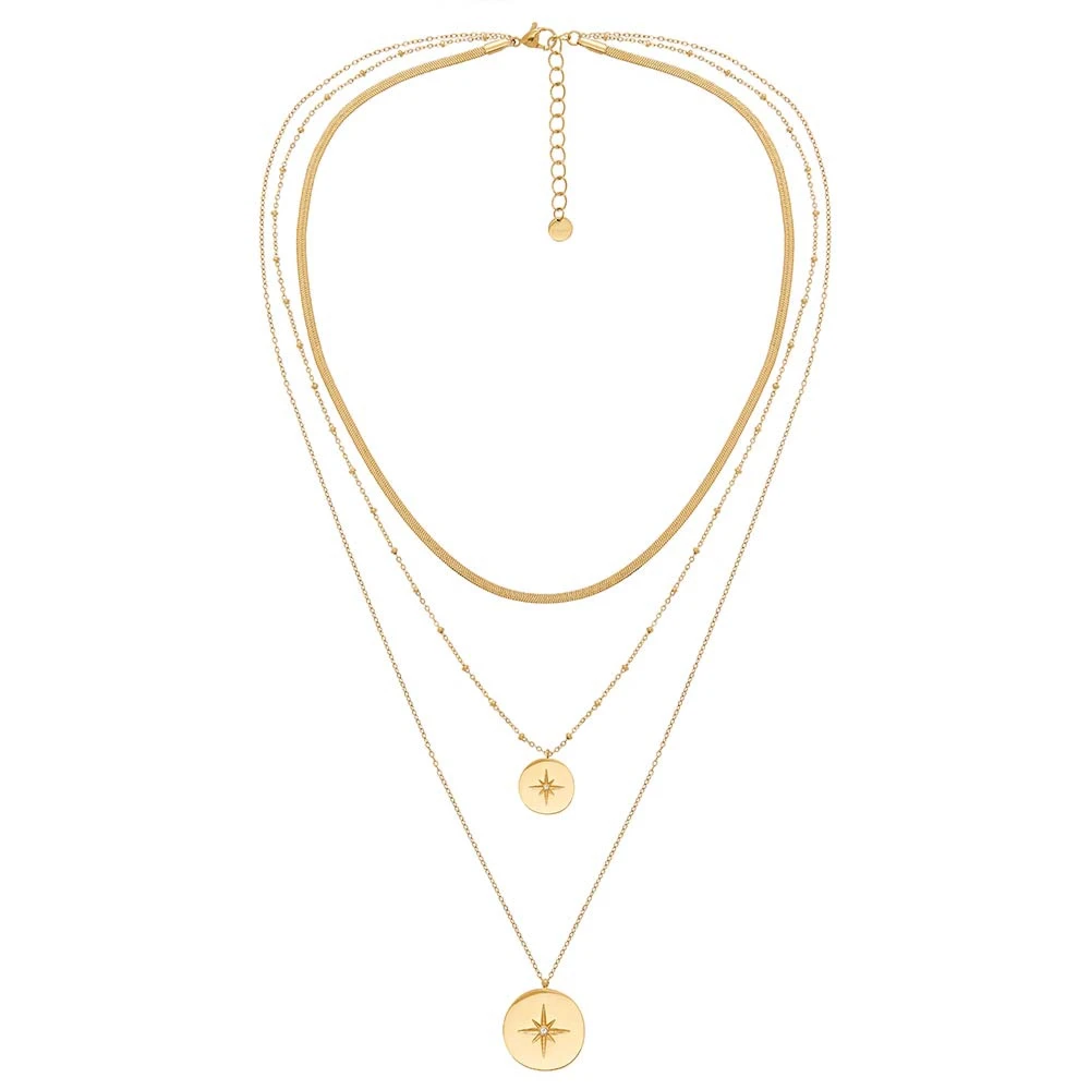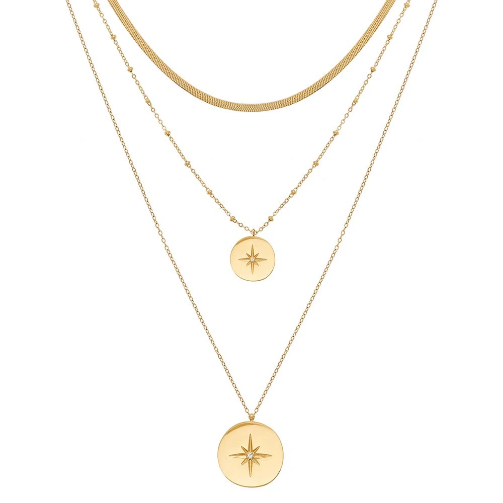 Collier multi rangs effet serpent et pendentif étoile polaire. Il est en acier chirurgical trempé dans un bain doré.