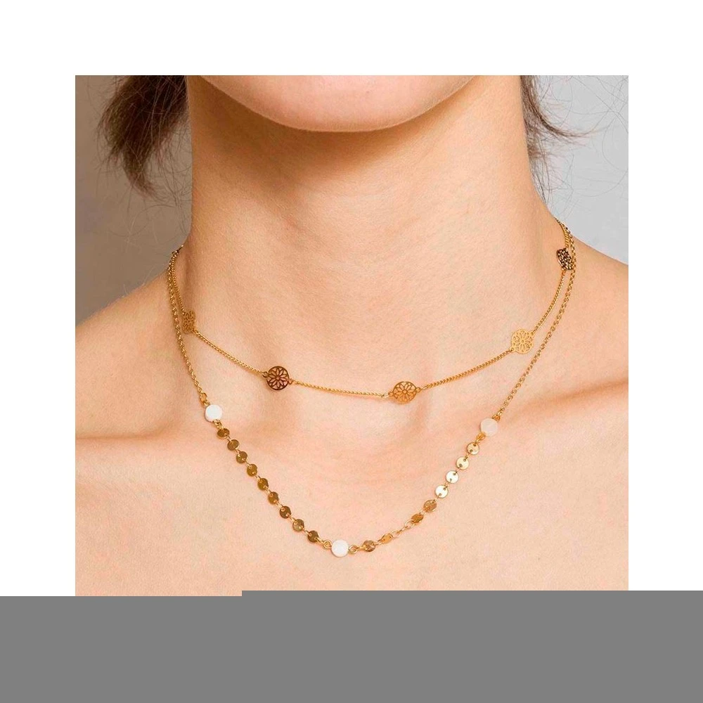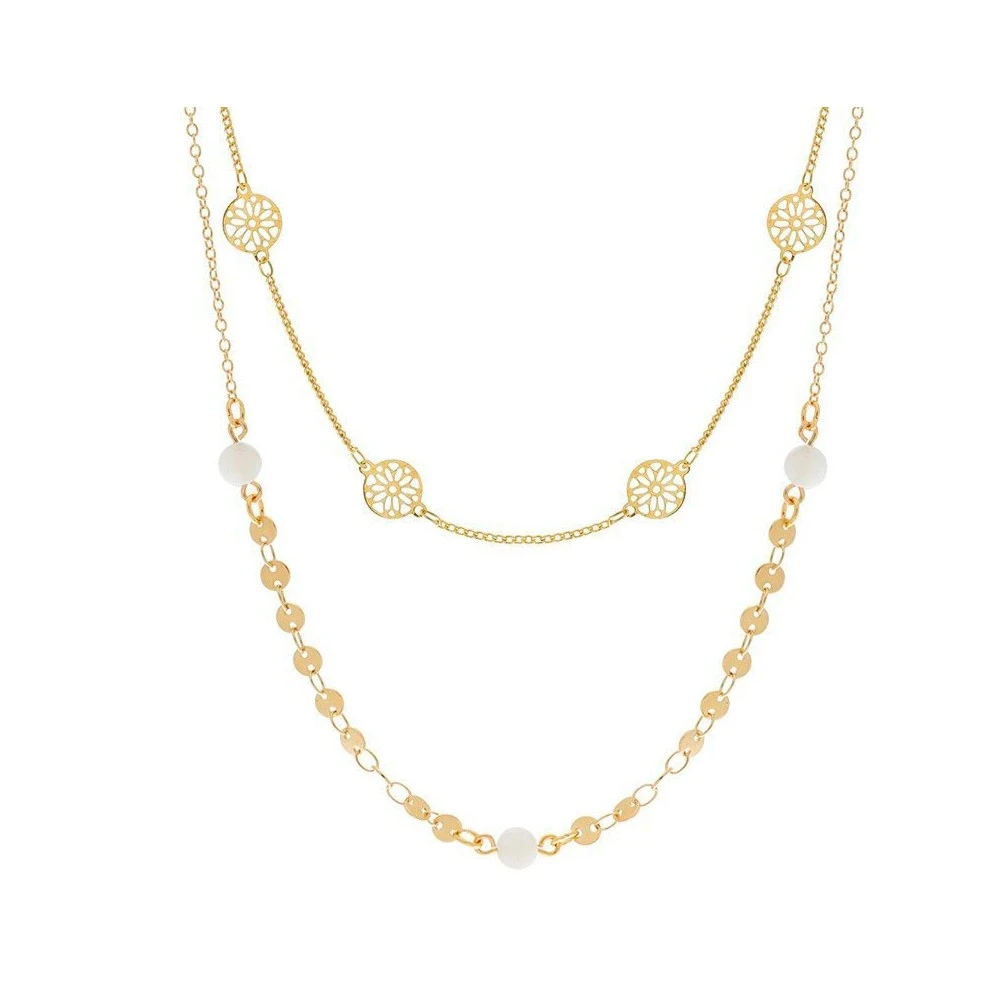 Collier double rangs signé Déesses aux mains nues, il se compose d’une succession de pastilles et de perles blanches sur la seconde chaîne.