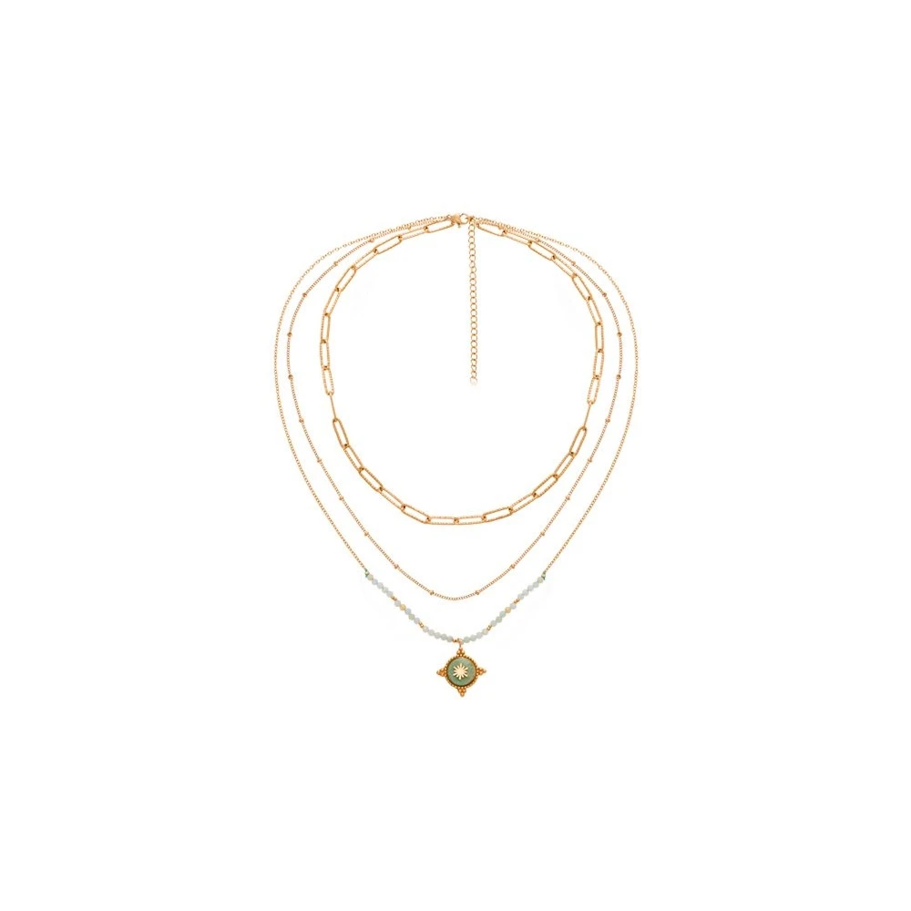 Il est composé de 3 chaines : une en maillons, une agrémentée de billes dorées et l’autre ornée de pierres en amazonite et d’un pendentif étoile.
