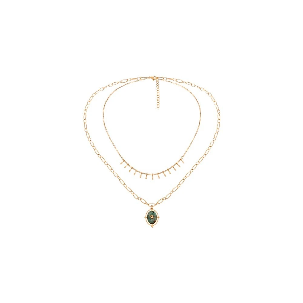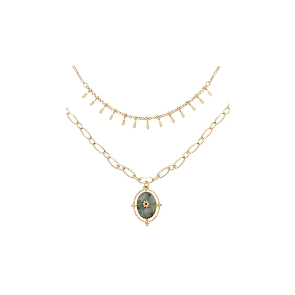 Il est composé de 2 chaines, l’une agrémentée de pampilles et l’autre d’une pierre facettée en turquoise africaine.