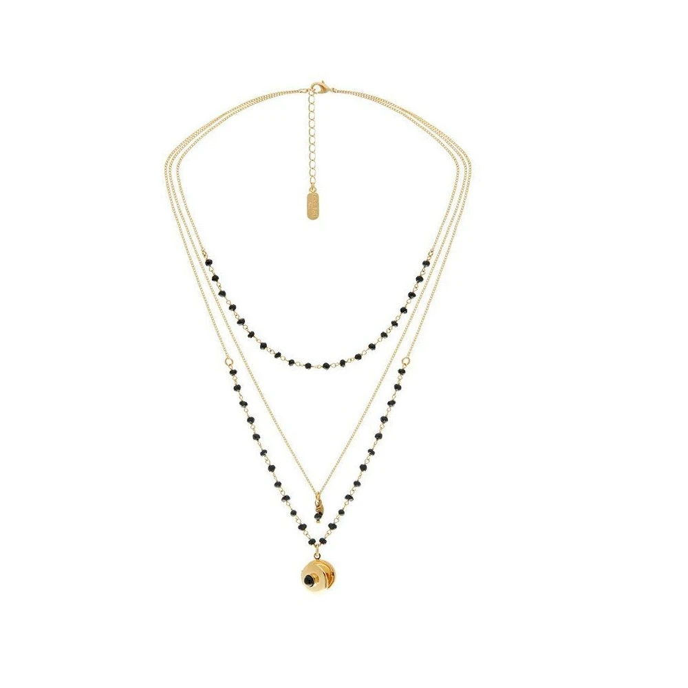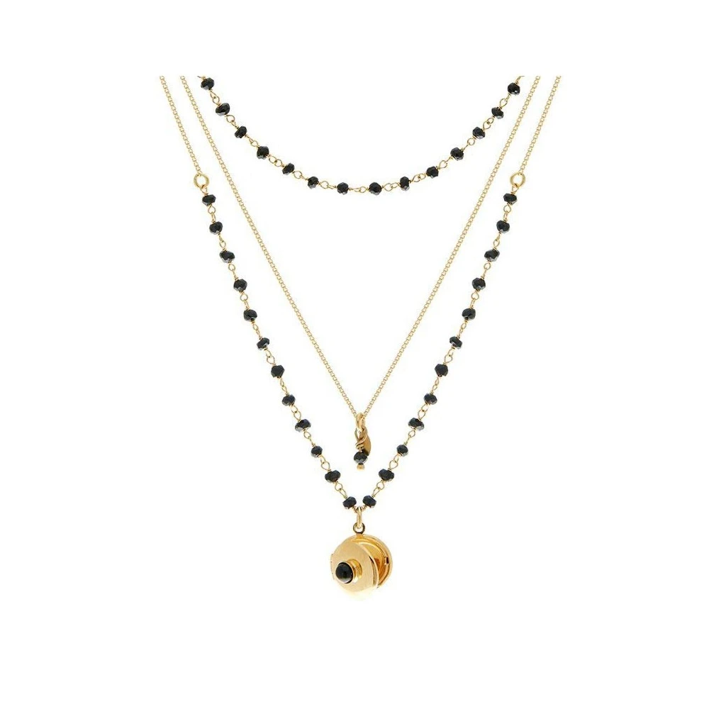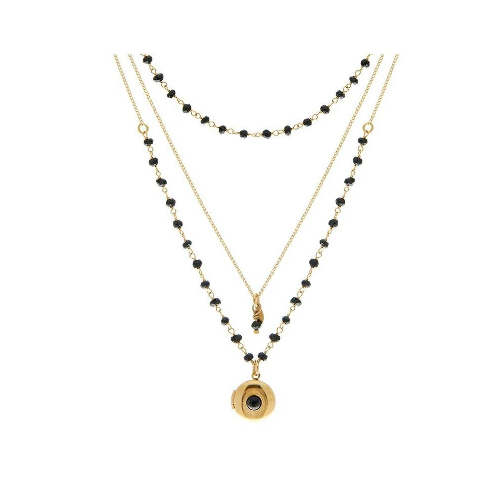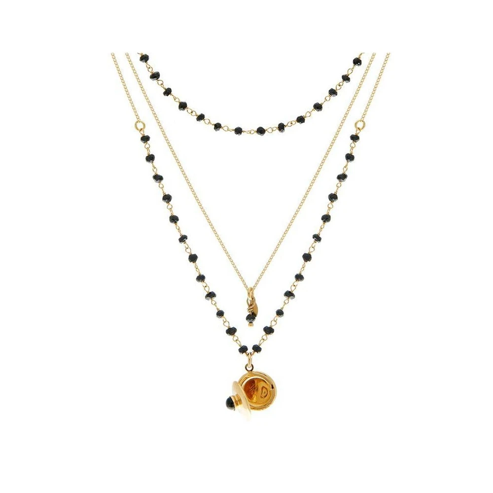 Collier en plaqué or 3 microns et 24 carats, signé Leticia Ponti, composé de trois différentes chaînes serties de pierres noires. Un médaillon photo lui sert de pendentif.