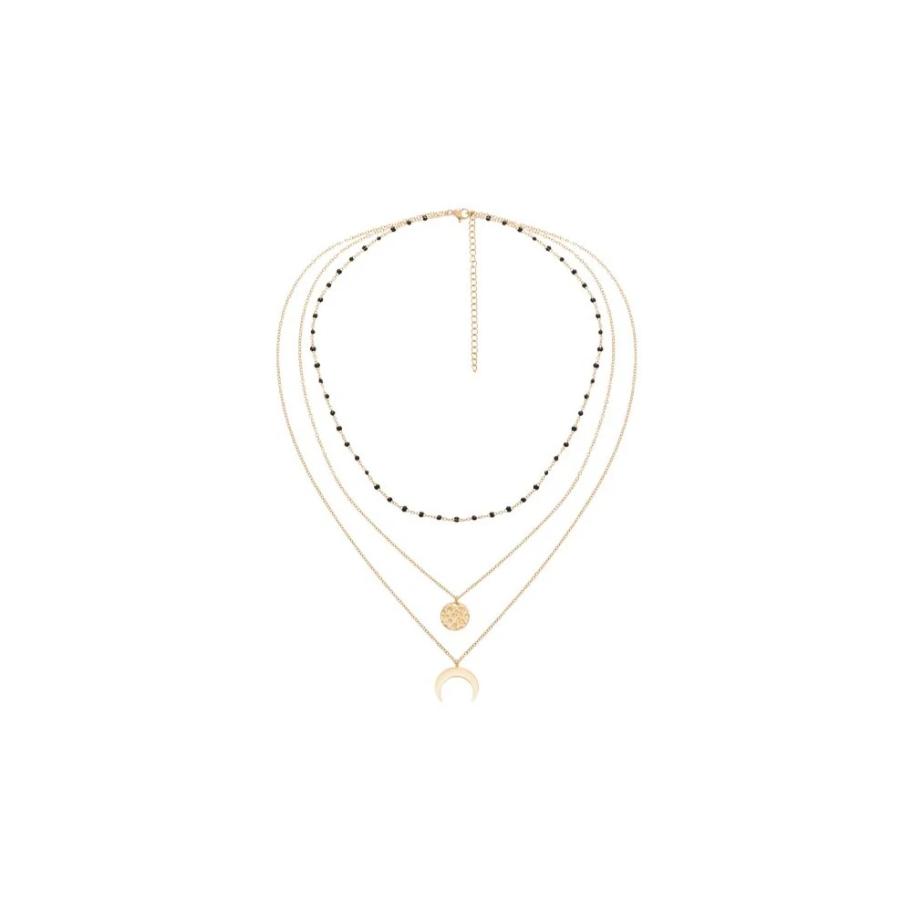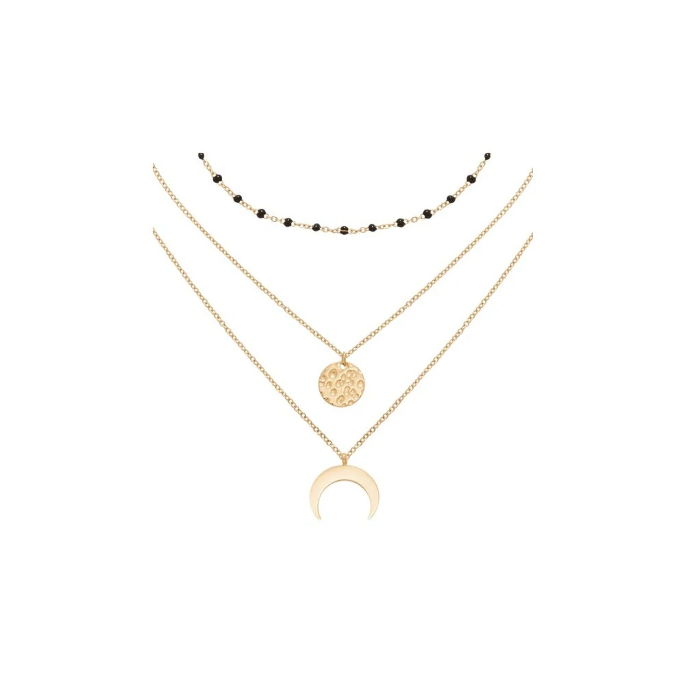Il est composé de 3 chaines, dont une avec des perles fines noires, une avec une médaille martelée et d’une autre avec une petite corne dorée.