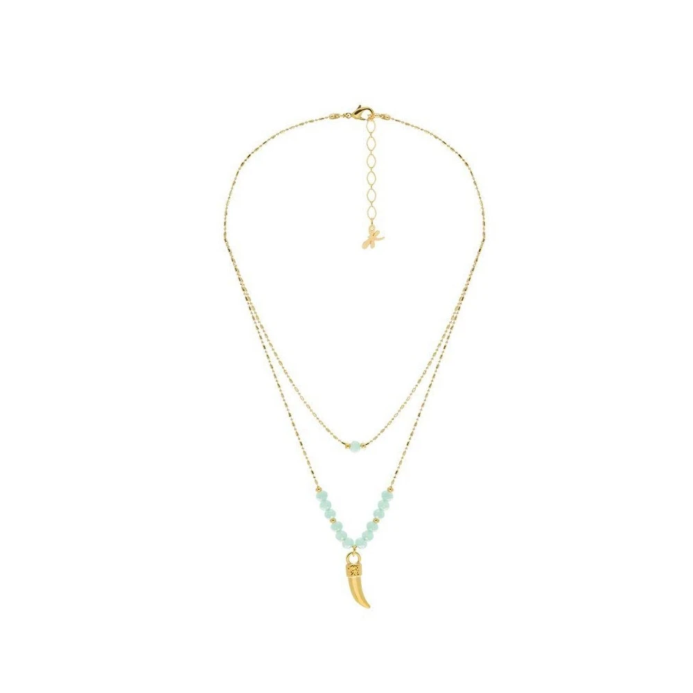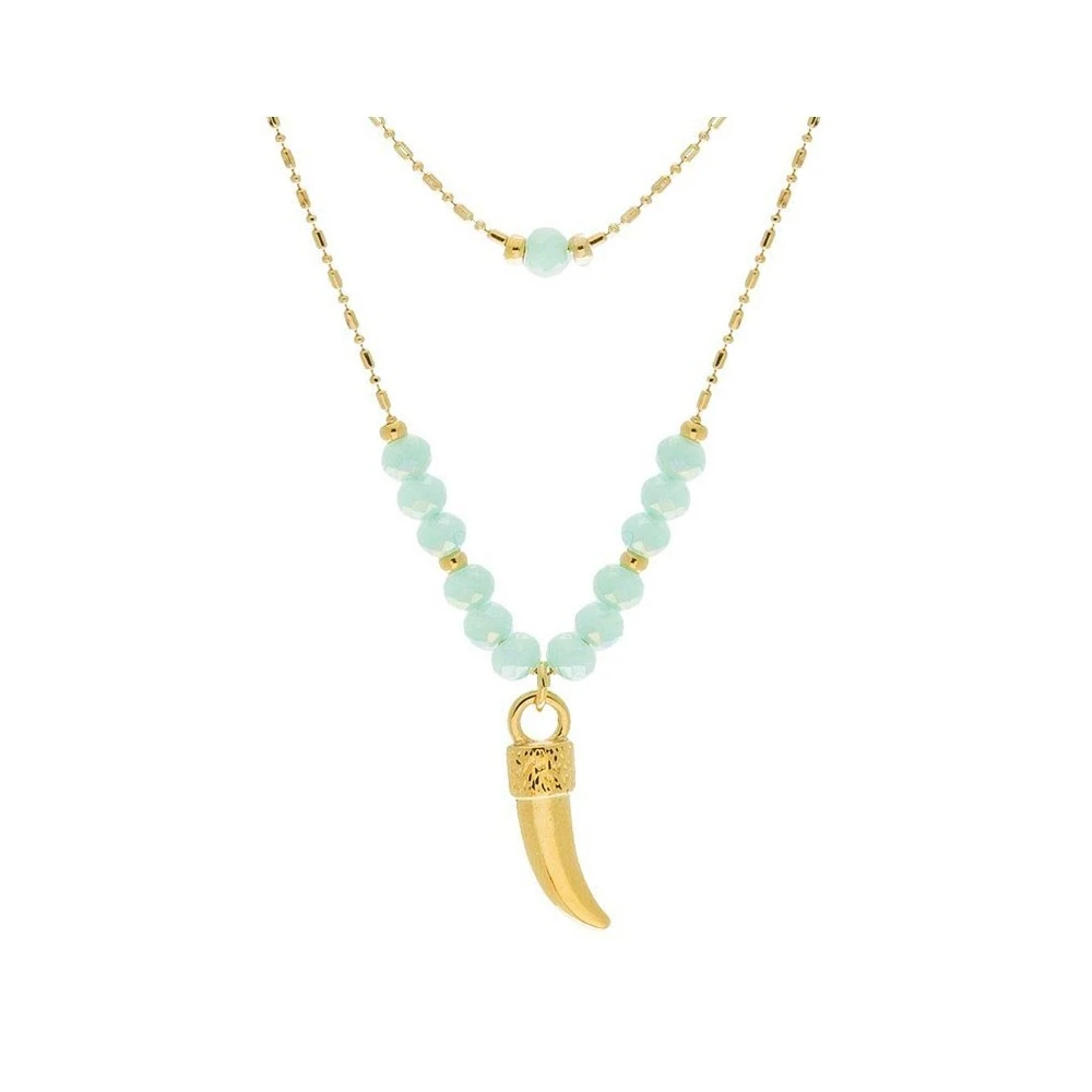 Collier signé Déesses aux mains nues, il se compose de deux rangs: le premier constitué d’une chaine dorée avec une perle verte claire, une autre chaîne dorée orné de perles vertes claires et d’un pendentif corne pour le second.