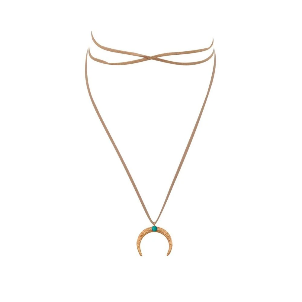 Habillez votre cou de lumière en cette saison avec ce collier du créateur Caroline Najman. Il se porte en trois tours et ce bijou est composé d’un fil suède beige avec un pendentif en laiton trempé dans un bain d’or en forme de lune sertie d’un cabochon turquoise. Un bijou décalé avec des formes sensuelles qui ne vous laissera pas de marbre !