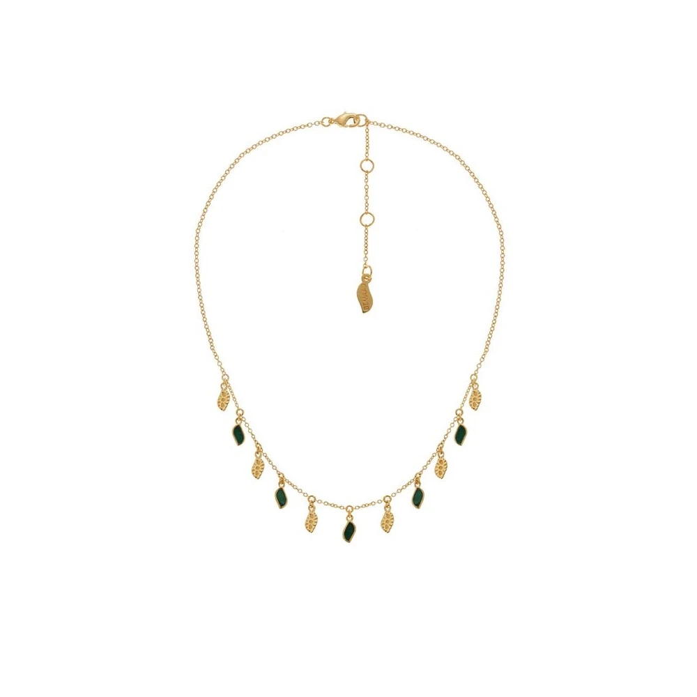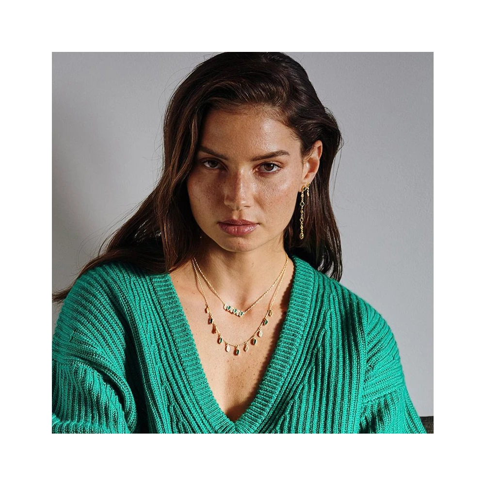 Ce collier de la collection Mali est signé Be Maad. Il est fabriqué à la main en laiton doré à l’or fin 18K et serti de pierres en onyx vert.