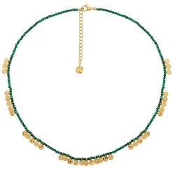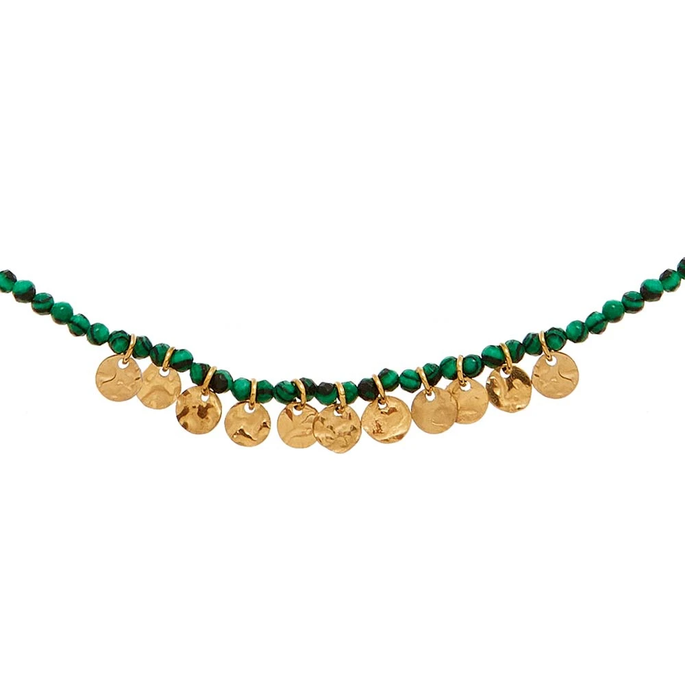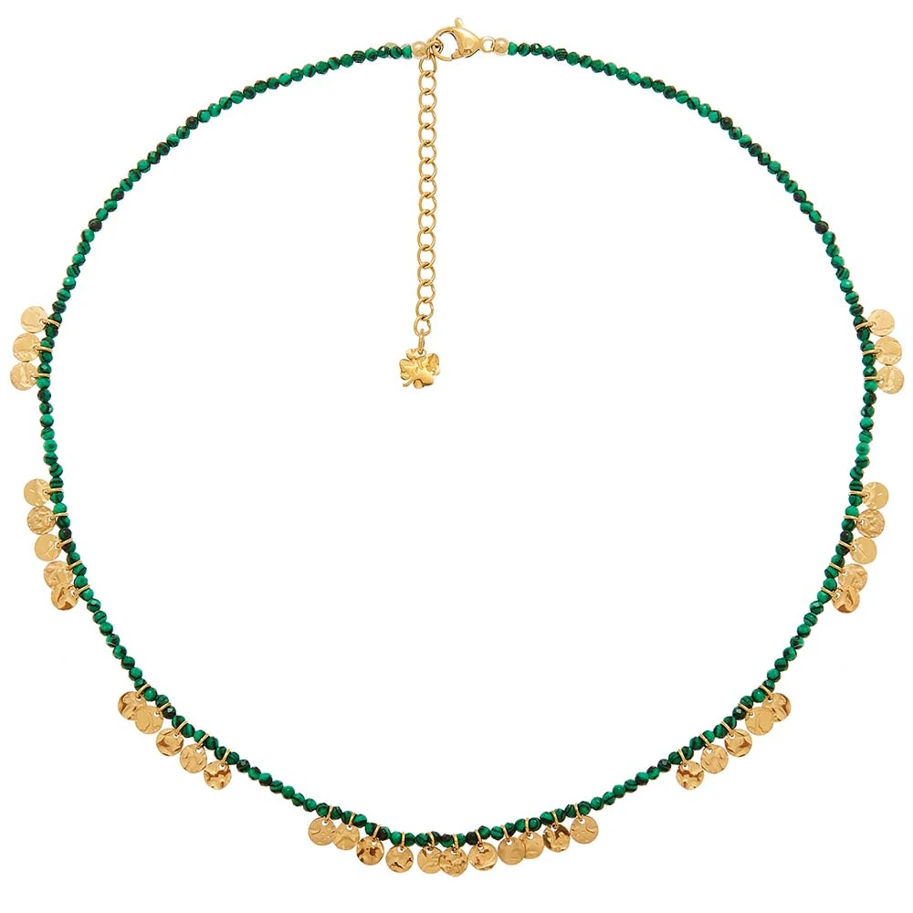 Collier de la marque Siloé, orné de fines pierres en malachite (vert) et parsemé de pastilles dorées. Le métal de ce bijou est entièrement en acier inoxydable.