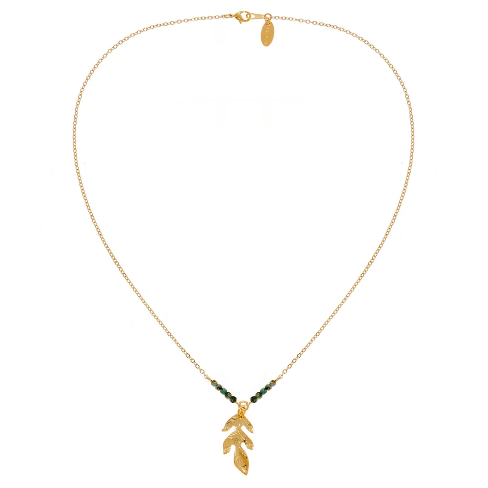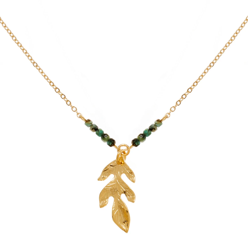 Collier pendentif feuille et pierres naturelles en jaspe africaine signé Viadoli, doré à l’or fin 24k.