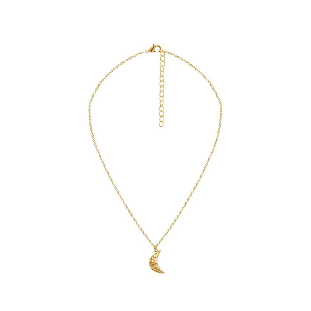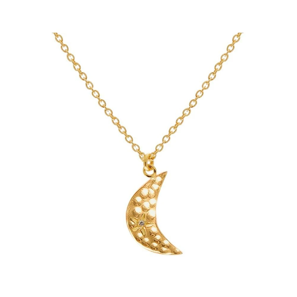 Ce collier en plaqué or signé By Jollia est composé d’un pendentif lune martelé, décoré d’une étoile sertie d’un strass.