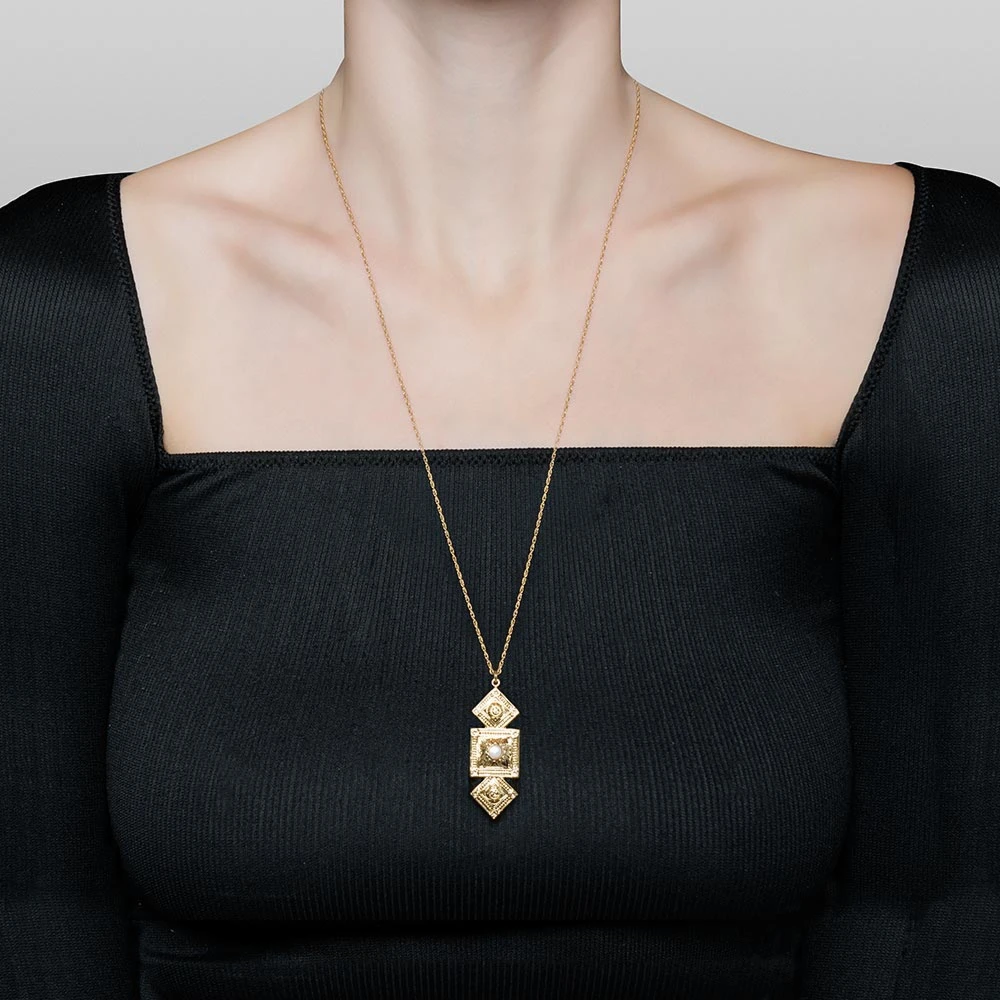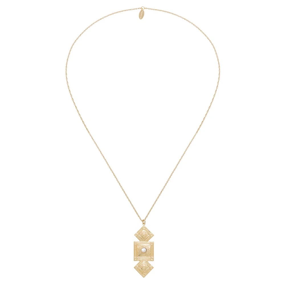 Le collier est orné de trois médailles carrées aux motifs ethniques. La médaille centrale est agrémentée d’une petite pierre ronde en nacre.