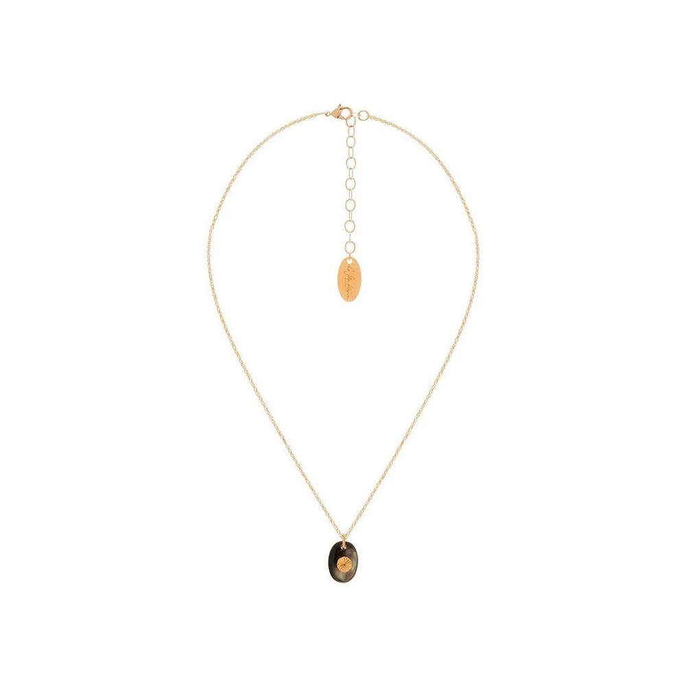 Ce collier signé les Folies d’Agnès en laiton doré à l’or fin plaqué 18K, composé d’un pendentif, et est agrémenté d’une pierre semi-préciseuse en nacre grise.