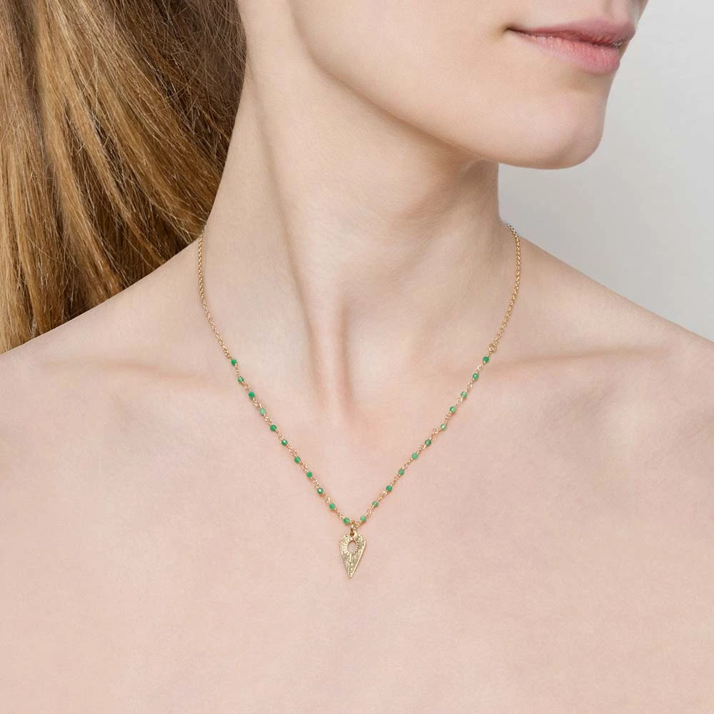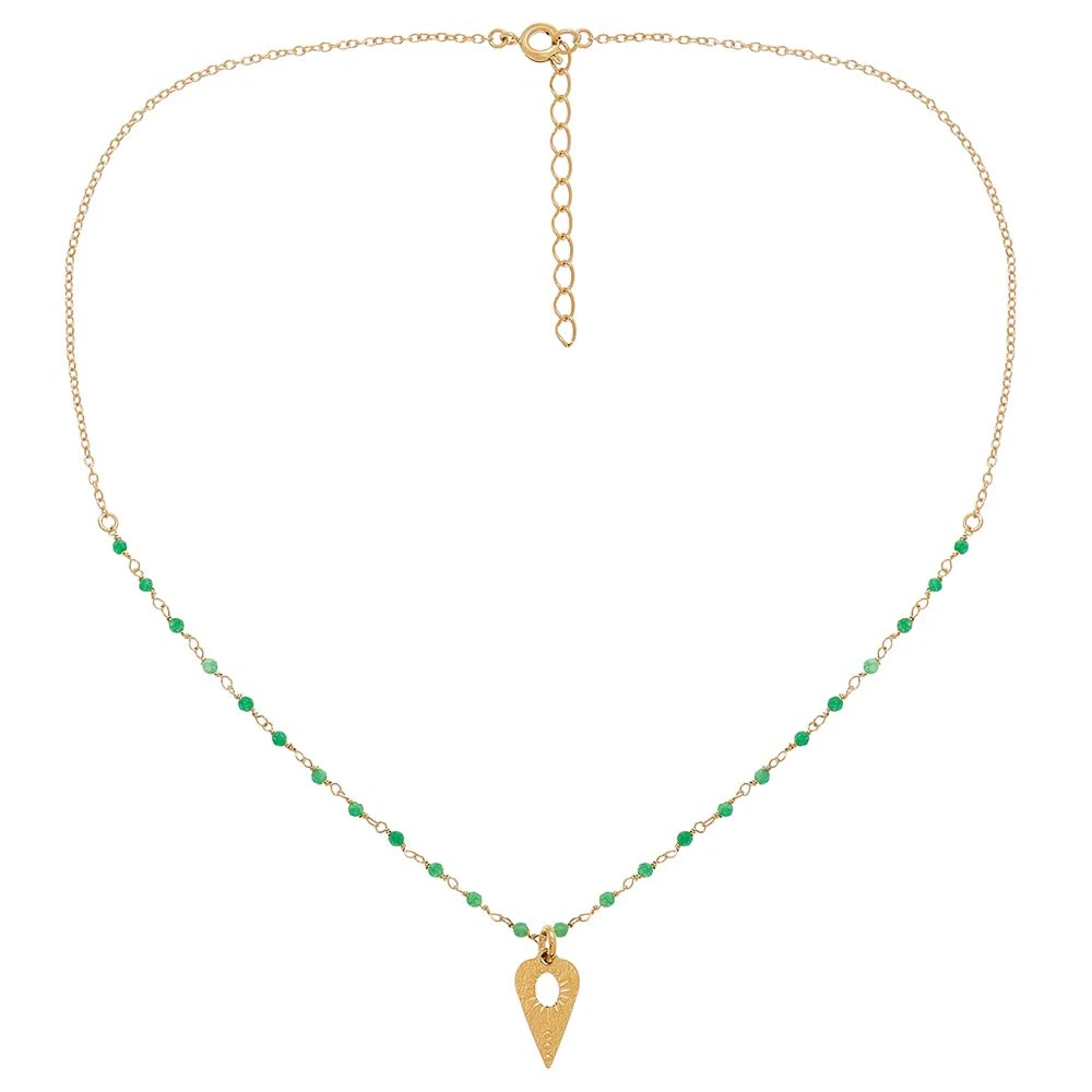 Ce collier long en laiton trempé dans un bain d’or signé Lovely Day, se compose d’une chaine fine, de perles de pierres emeraude et d’un pendentif en forme de coeur ajouré.