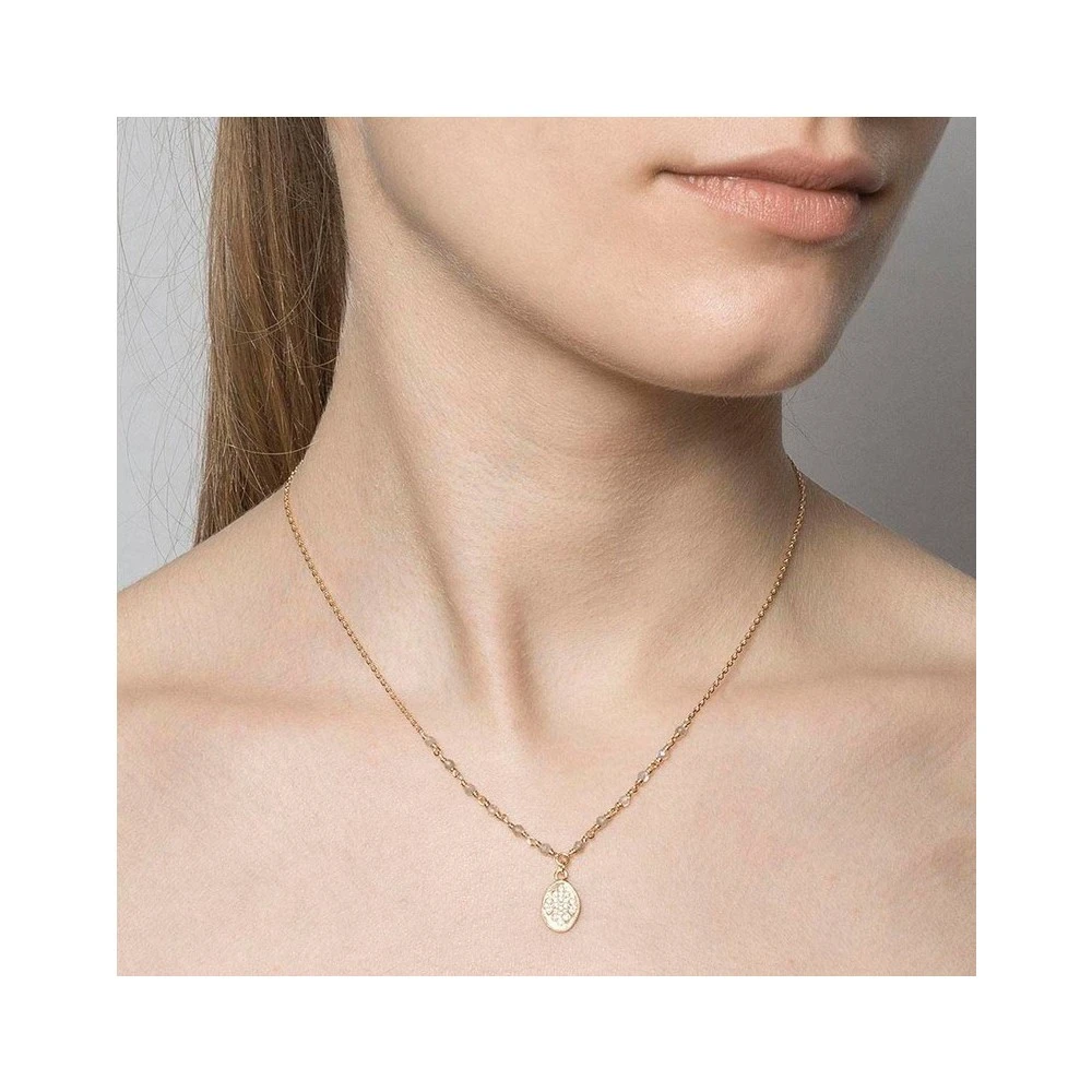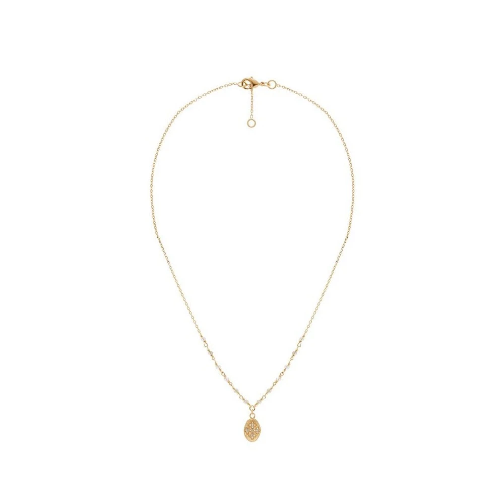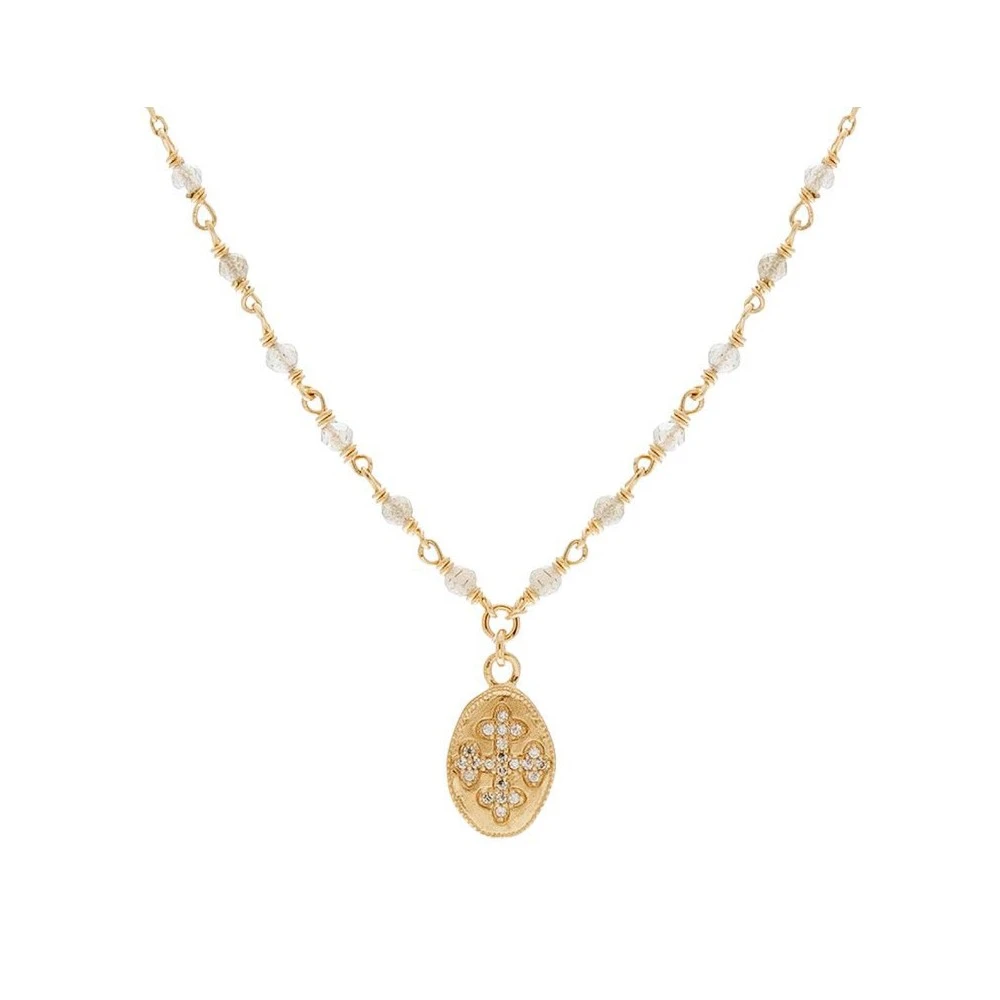 Ce collier signé By Jollia est composé d’une fine chaîne en plaqué or, ornée de perles noires et d’un pendentif médaille ovale avec une croix sertie de strass noirs.