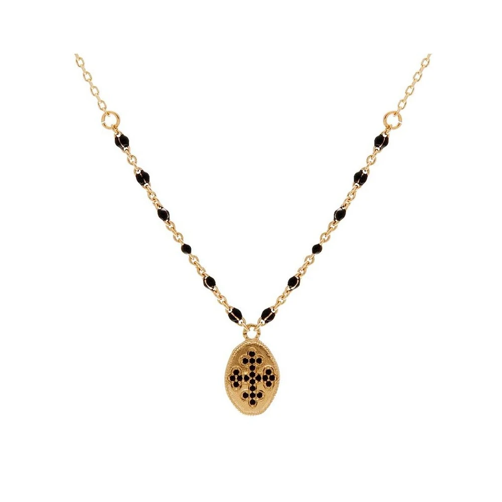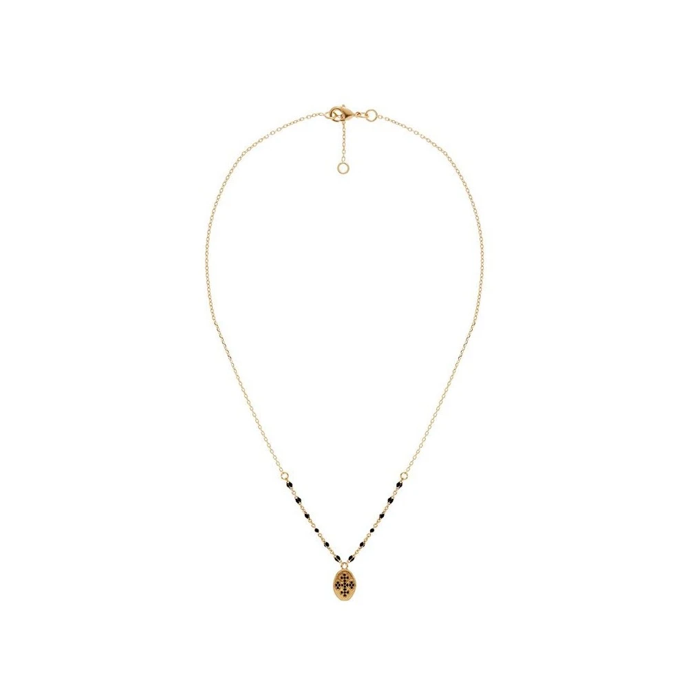 Ce collier signé By Jollia est composé d’une fine chaîne en plaqué or, ornée de perles noires et d’un pendentif médaille ovale avec une croix sertie de strass noirs.