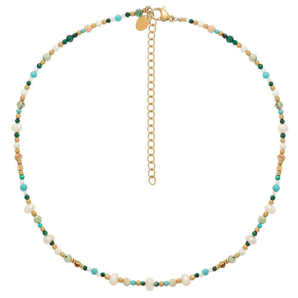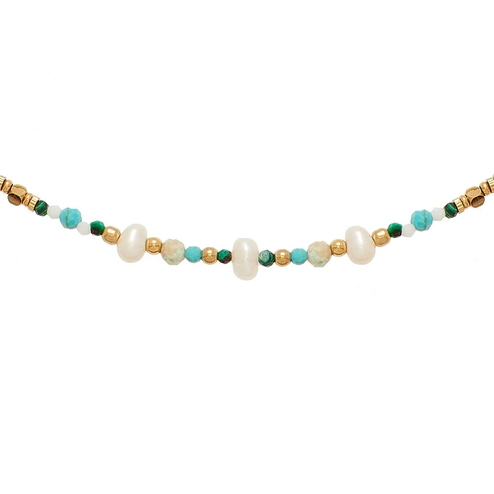 Collier de plusieurs perles fines semi-précieuses: malachite, perles de culture, turquoise, amazonite et des perles dorées. Il est en acier inoxydable trempé dans un bain doré signé Siloé.