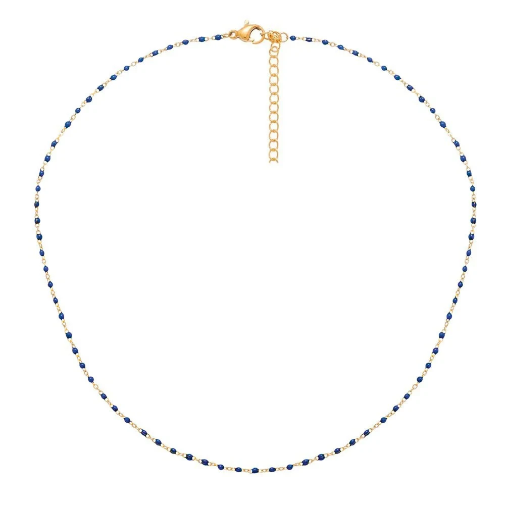 Collier petites perles émaillées bleues. Il est en acier chirurgical trempé dans un bain doré.