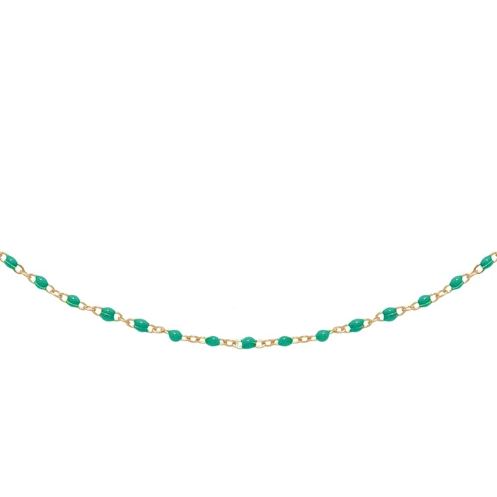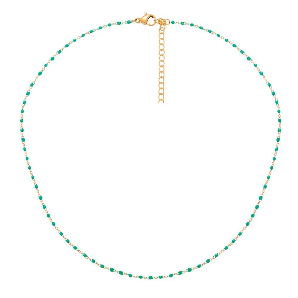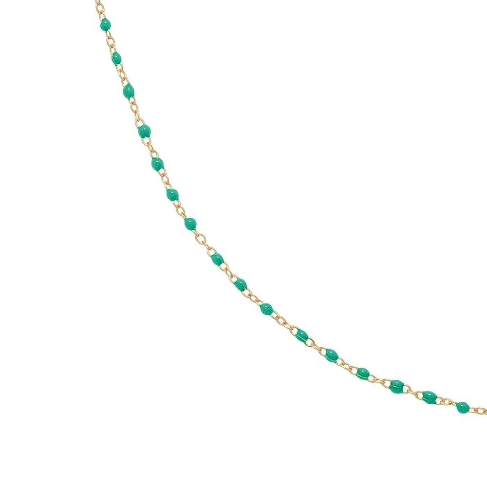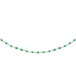 Collier doté de petites perles émaillées en turquoise, en acier chirurgical trempé dans un bain doré de la marque Siloé.