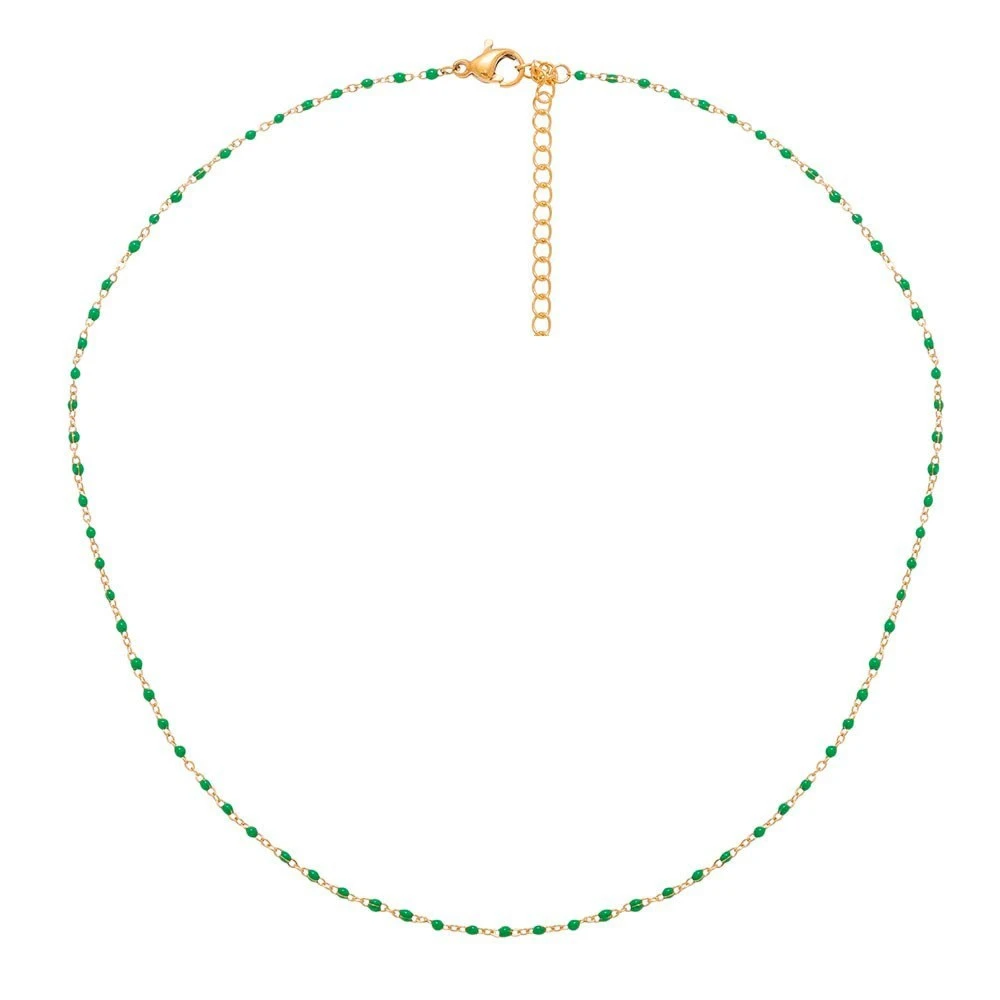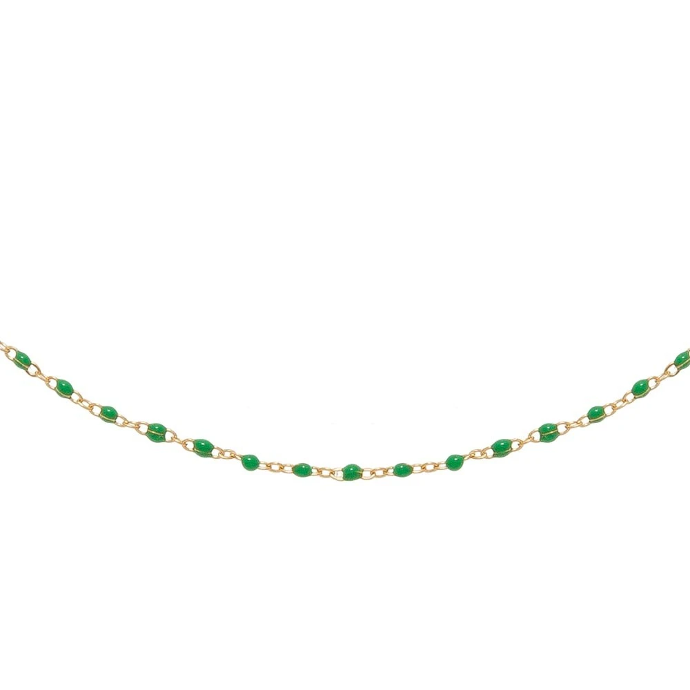 Collier doté de petites perles émaillées vertes. Il est en acier chirurgical trempé dans un bain doré.