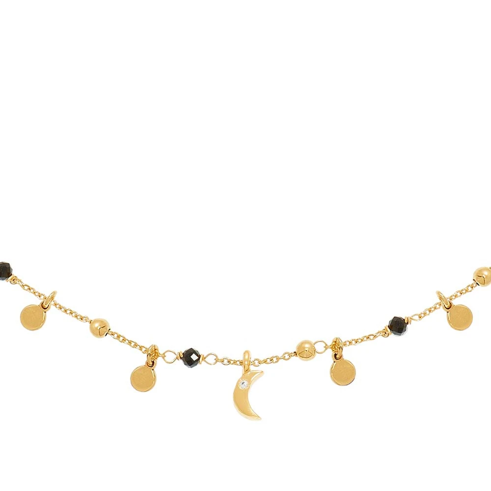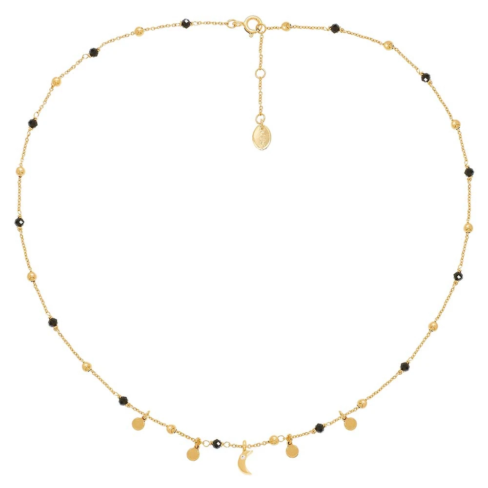 Collier orné de pierres noires, de petites pastilles dorées et d’une lune signé Une A Une, en laiton doré à l’or fin.
