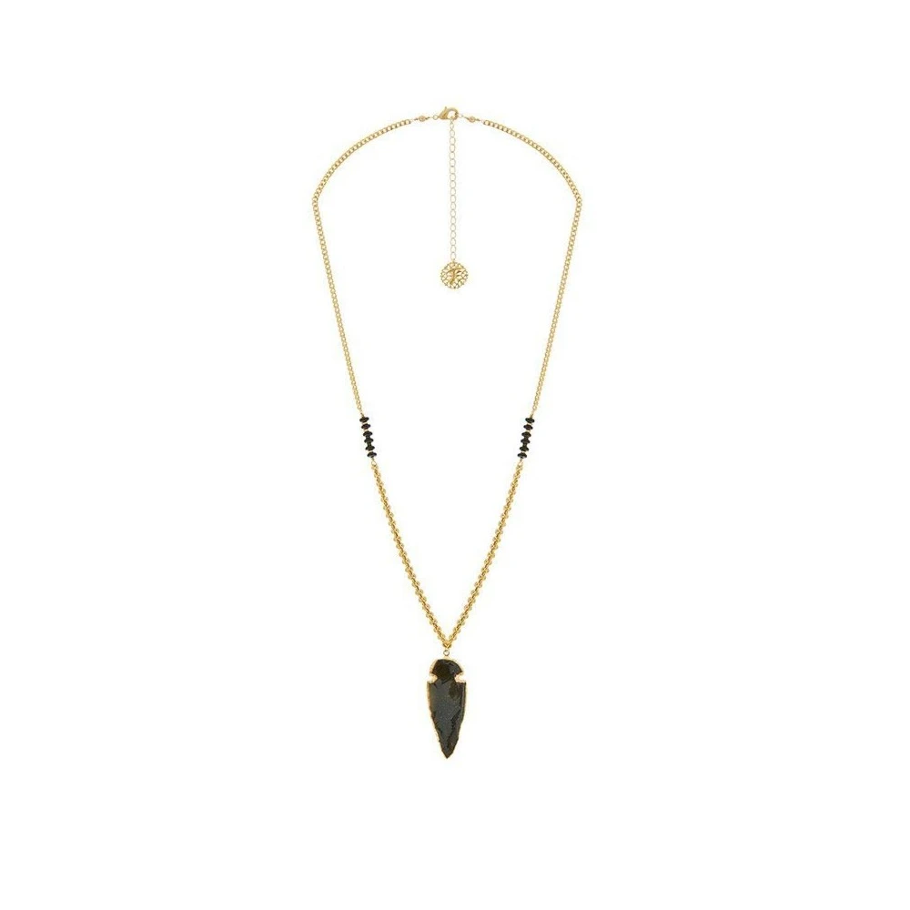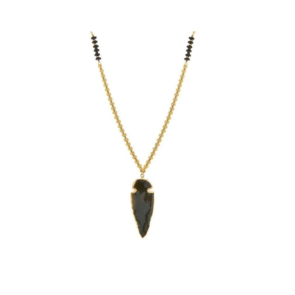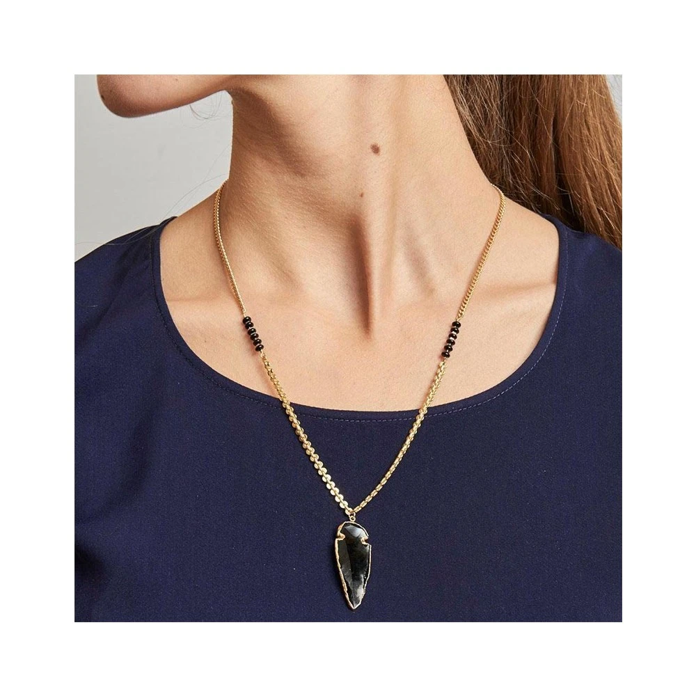 Craquez pour ce collier chic de notre créateur Tungstene. Il se compose d’une chaîne en diverses mailles et de deux séries de perles en verre et agates noires. Son pendentif est un biface en hématite à contour doré.