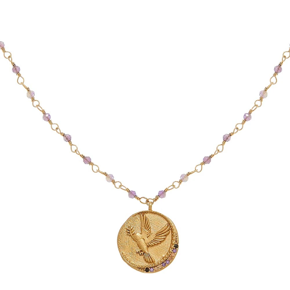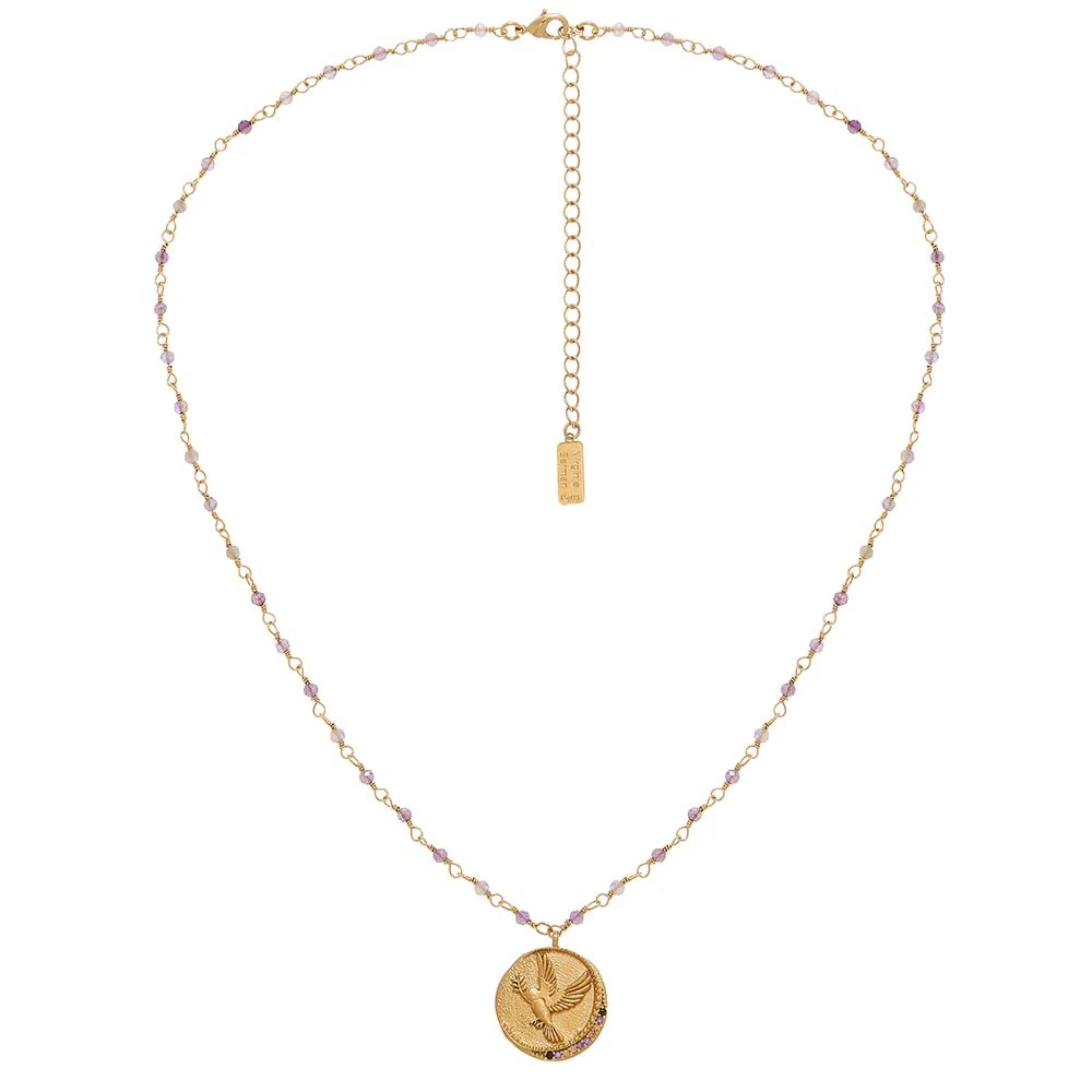 Ce collier est doré à l’or fin 18k et est signé Virginie Berman, la chaîne est ornée de petites pierres semi précieuses d’améthyste et accompagnée d’un pendentif gravure aigle. Parfait pour être porté au quotidien !