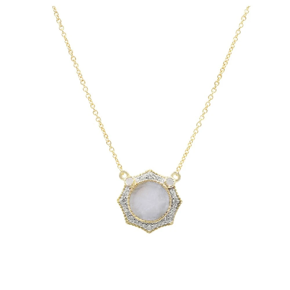 Ce collier, signé Be Maad, est serti d’une pierre de lune ronde entourée de zircons. Il est fabriqué à la main en laiton doré à l’or fin 18K.