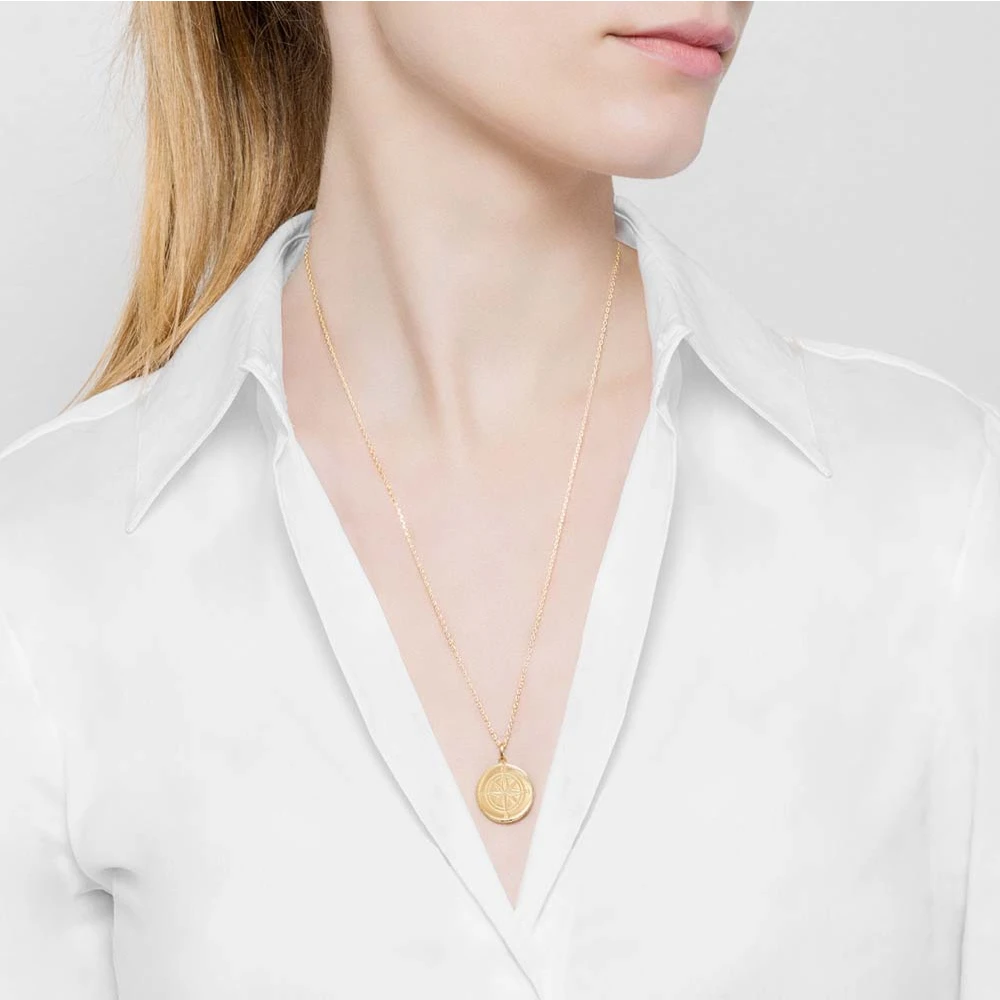 Ce collier signé ByJollia en plaqué or est composé d’une médaille dans laquelle est gravée une rose des vents et chaîne émaillée.