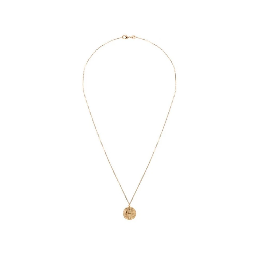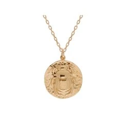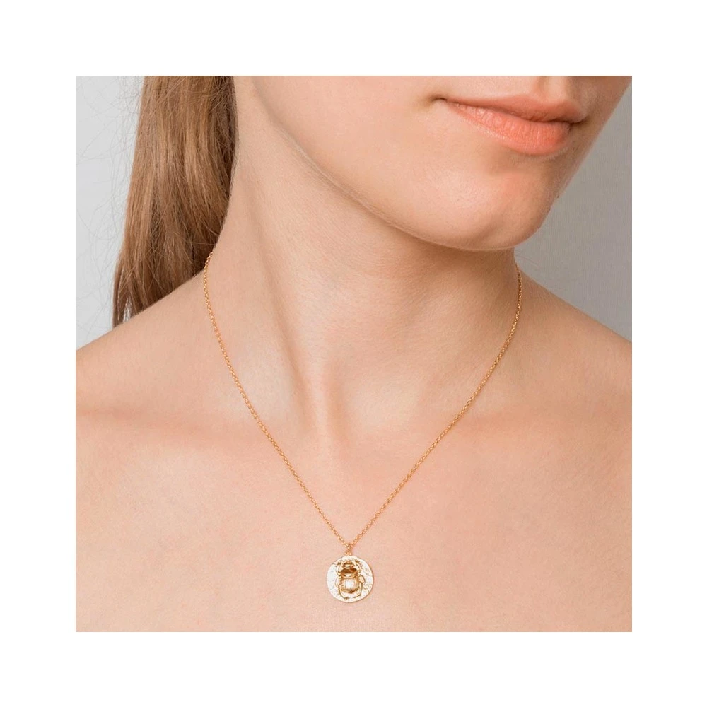 Ce collier scarabée est signé By Jollia. Il est en plaqué or et composé d’un pendentif médaille ronde, sur lequel se trouve un scarabée en relief.