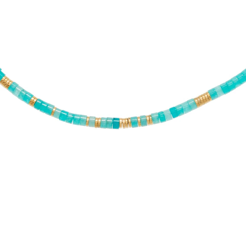 Collier surfeur agrémenté de pierres bleues apatite en acier chirurgical trempé dans un bain doré signé Siloé.