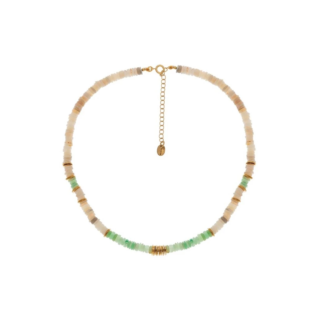 Ce collier surfeur pierres fines signé Une A Une est agrémenté de pierres disques en opale verte et blanc.