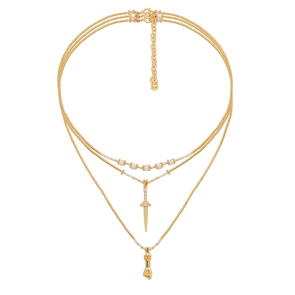 Le coffret se compose d’un collier orné de perles blanches et de disques dorés, d’un collier orné d’un pendentif épée et zircons et d’un collier long orné d’une main dorée.