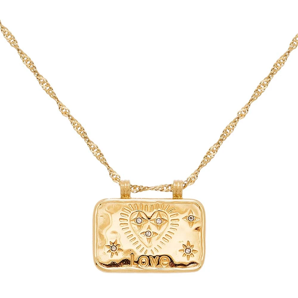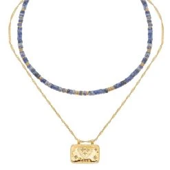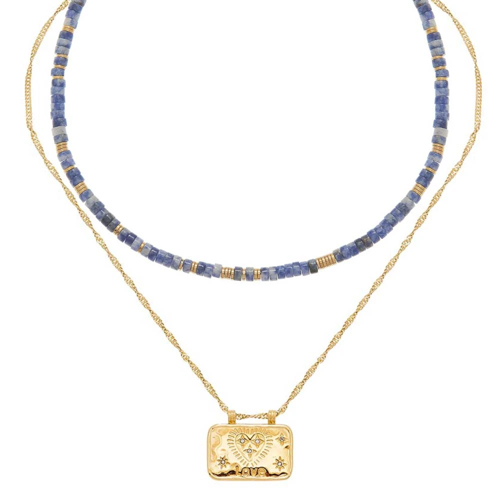 Le premier collier est orné de pierres fines en lapis. Le deuxième collier est orné d’une médaille rectangulaire, effet talisman avec des gravures coeurs et LOVE