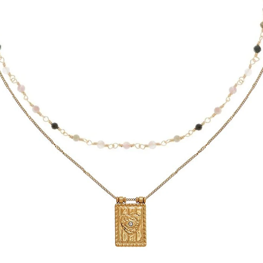 Le premier collier est orné de pierres fines tourmaline. Le deuxième collier est orné d’une médaille rectangulaire, effet talisman avec un oeil en forme de coeur.