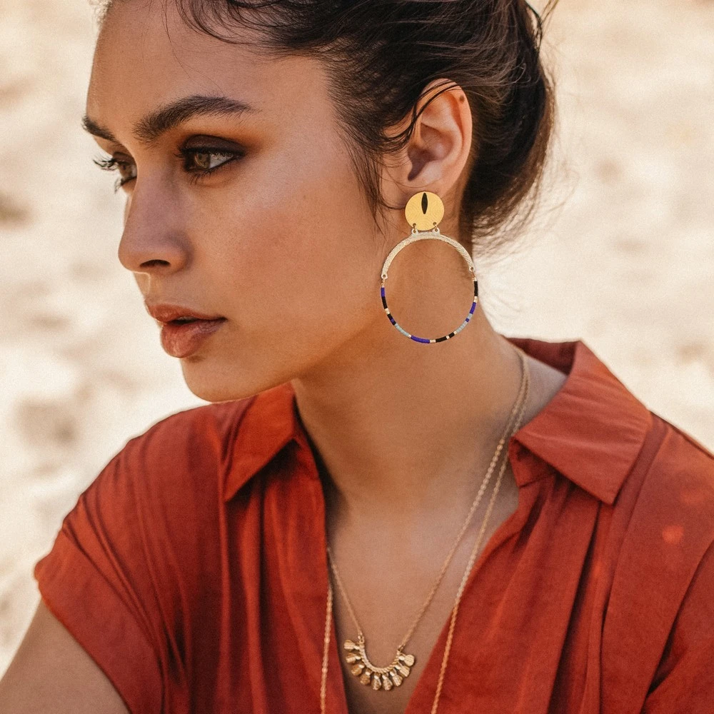 Boucles d’oreilles créoles tressées signées Laëti Trëma, dorées à l’or fin 24 carats et composées de perles miyuki vertes.