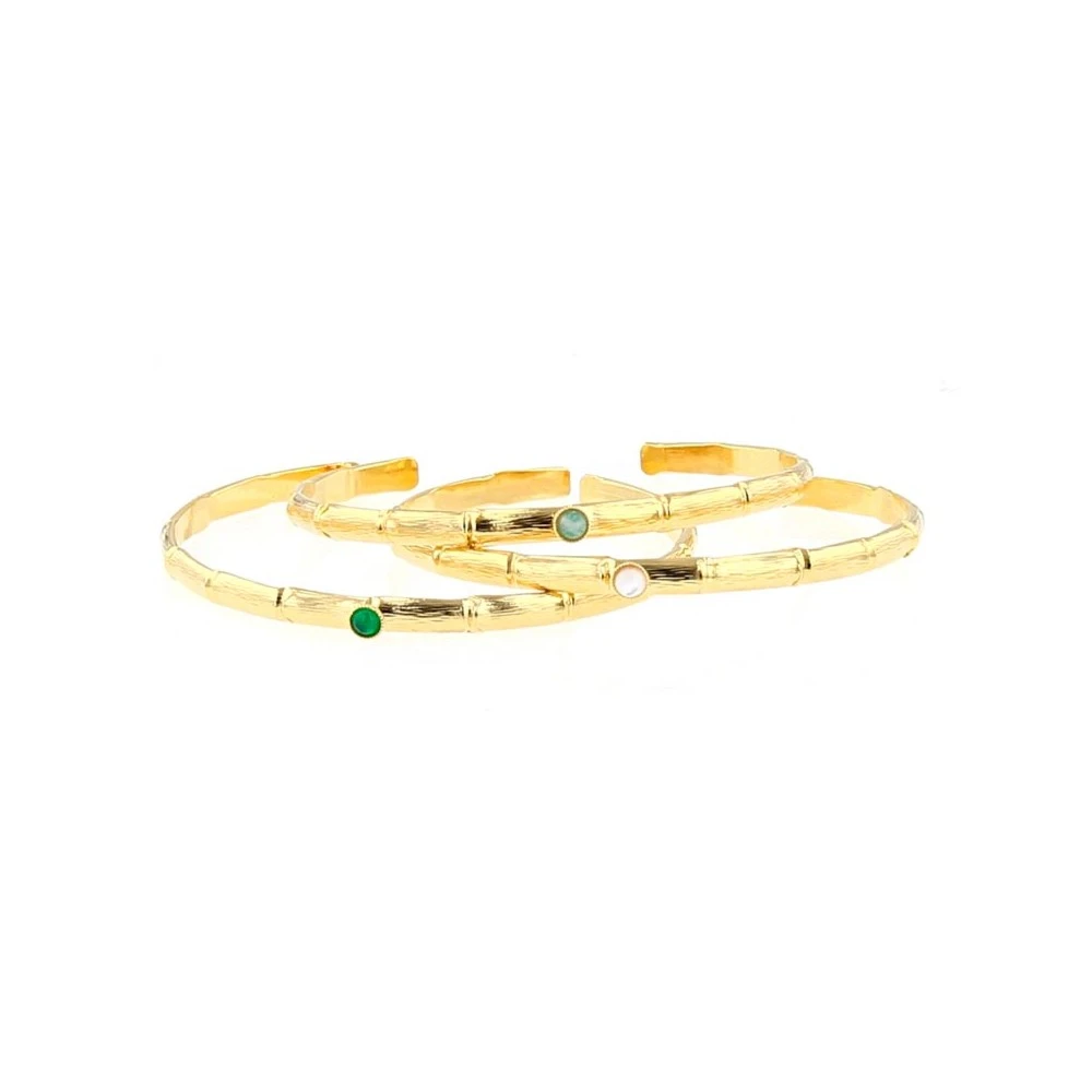 Ce bracelet bambou de la collection Alang, signé Laëti Trëma et doré à l’or fin 24 carats est composé d’une pierre semi-précieuse en grenat.
