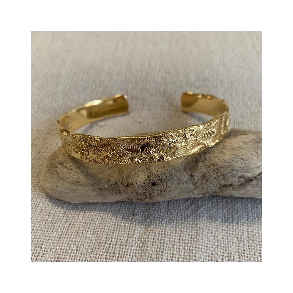 Ce bracelet jonc mystique est signé Louise Hendricks. Il est trempé dans un bain d’or 1 micron, et composé de plusieurs zircons.